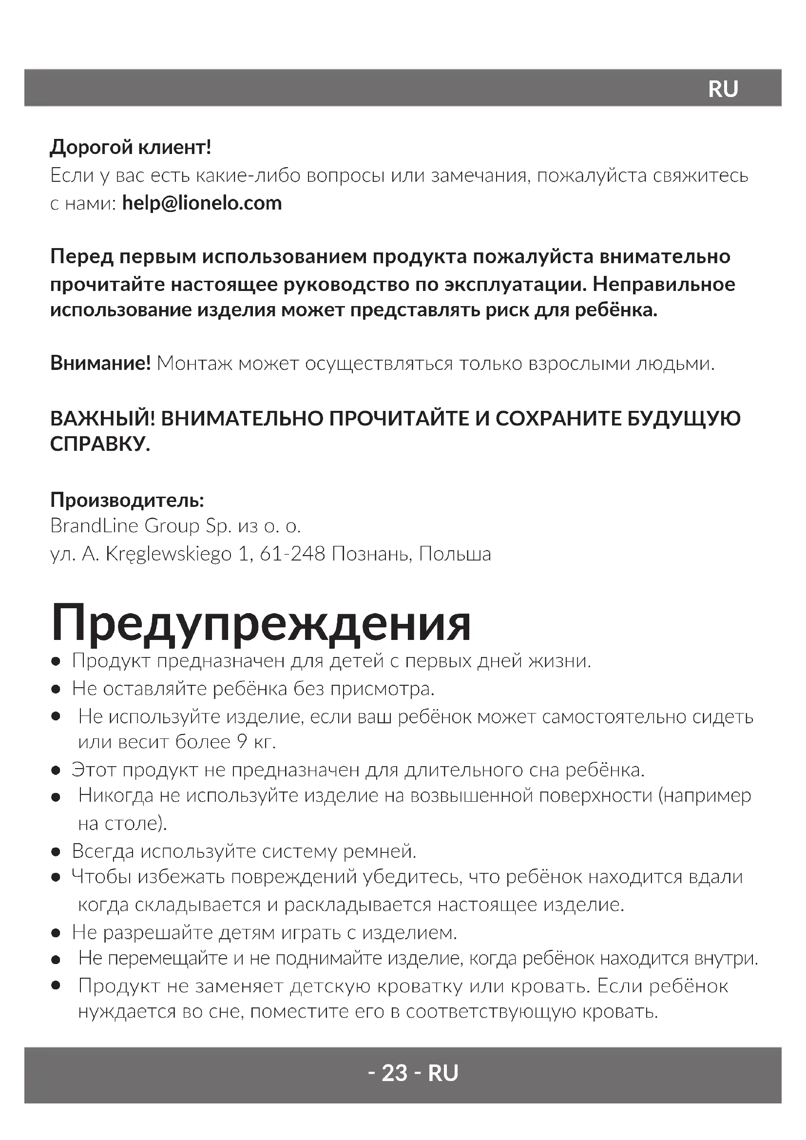 Продукт не заменяет детскую кроватку или кровать. Если ребёнок нуждается во сне, поместите его в соответствующую кровать. RU‑ 24 ‑RU