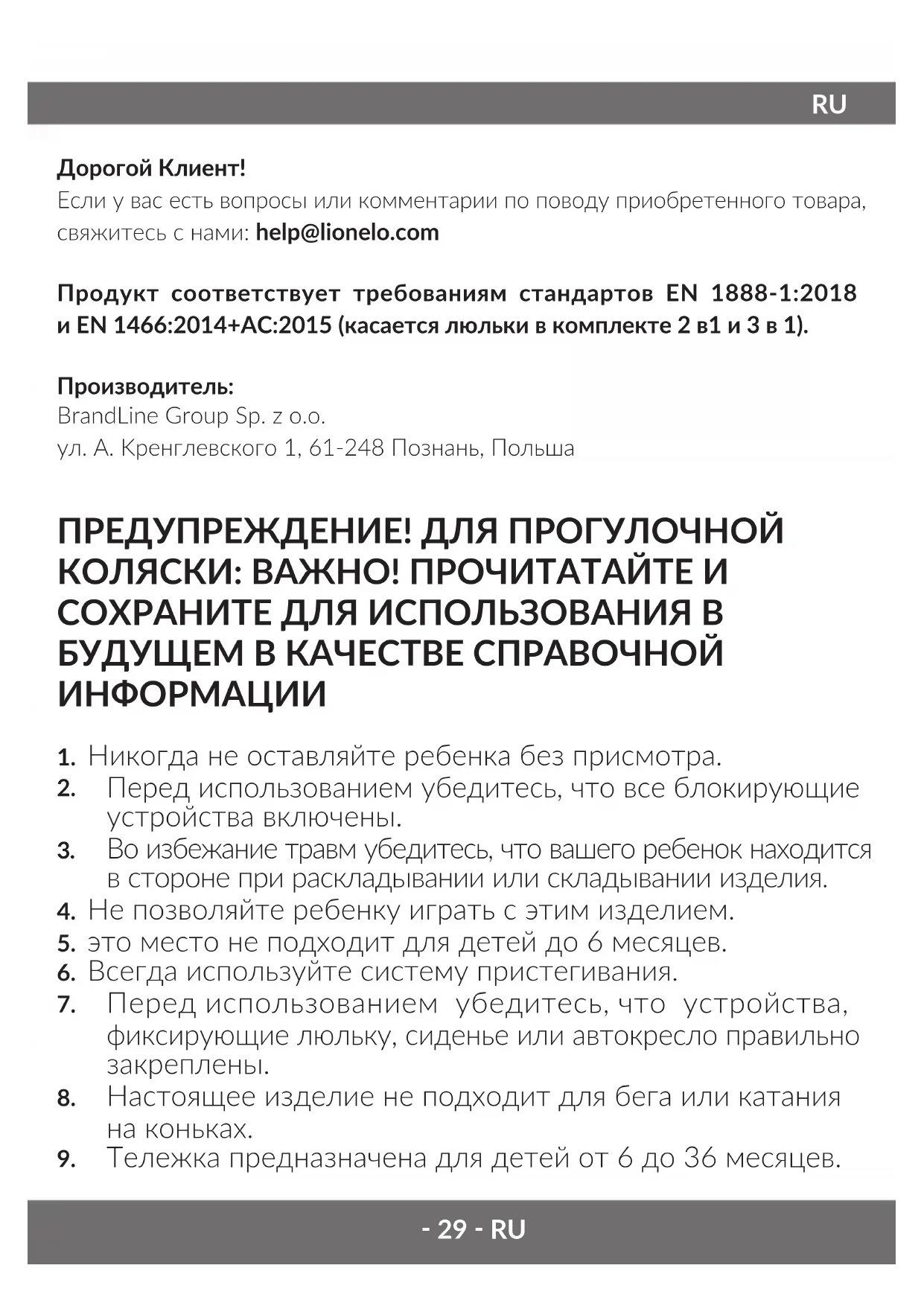 Дорогой Клиент! Если у вас есть вопросы или комментарии по поводу приобретенного товара, свяжитесь с нами: help@lionelo.com Продукт соответствует требованиям стандартов EN 1888-1:2018 и EN 1466:2014+AC:2015 (касается люльки в комплекте 2 в1 и 3 в 1). Производитель: BrandLine Group Sp. z o.o. ул. A. Kренглевского 1, 61-248 Познань, Польша ПРЕДУПРЕЖДЕНИЕ! ДЛЯ ПРОГУЛОЧНОЙ КОЛЯСКИ: ВАЖНО! ПРОЧИТАТАЙТЕ И СОХРАНИТЕ ДЛЯ ИСПОЛЬЗОВАНИЯ В БУДУЩЕМ В КАЧЕСТВЕ СПРАВОЧНОЙ