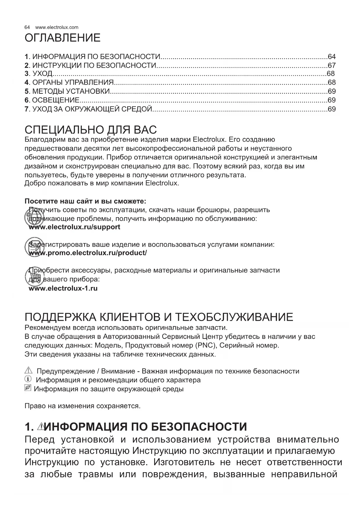 СПЕЦИАЛЬНО ДЛЯ ВАС Благодарим вас за приобретение изделия марки Electrolux. Его созданию предшествовали десятки лет высокопрофессиональной работы и неустанного обновления продукции. Прибор отличается оригинальной конструкцией и элегантным дизайном и сконструирован специально для вас. Поэтому всякий раз, когда вы им пользуетесь, будьте уверены в получении отличного результата. Добро пожаловать в мир компании Electrolux. Посетите наш сайт и вы сможете: Получить советы по эксплуатации, скачать наши брошюры, разрешить возникающие проблемы, получить информацию по обслуживанию: www.electrolux.ru/support Зарегистрировать ваше изделие и воспользоваться услугами компании: www.promo.electrolux.ru/product/ Приобрести аксессуары, расходные материалы и оригинальные запчасти для вашего прибора: www.electrolux-1.ru ПОДДЕРЖКА КЛИЕНТОВ И ТЕХОБСЛУЖИВАНИЕ Рекомендуем всегда использовать оригинальные запчасти. В случае обращения в Авторизованный Сервисный Центр убедитесь в наличии у вас следующих данных: Модель, Продуктовый номер (PNC), Серийный номер. Эти сведения указаны на табличке технических данных. Предупреждение / Внимание - Важная информация по технике безопасности Информация и рекомендации общего характера Информация по защите окружающей среды Право на изменения сохраняется.