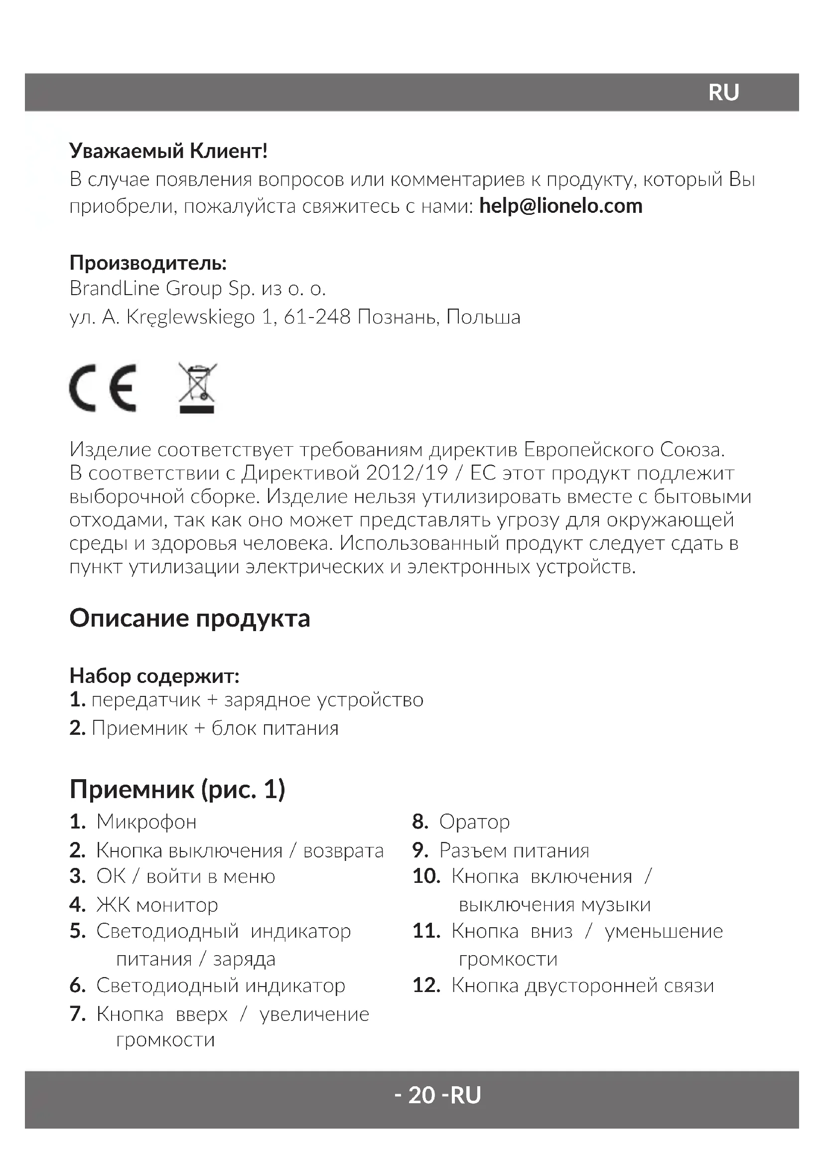 Уважаемый Клиент! В случае появления вопросов или комментариев к продукту, который Вы приобрели, пожалуйста свяжитесь с нами: help@lionelo.com Производитель: BrandLine Group Sp. из о. о. ул. A. Kręglewskiego 1, 61-248 Познань, Польша Изделие соответствует требованиям директив Европейского Союза. В соответствии с Директивой 2012/19 / ЕС этот продукт подлежит выборочной сборке. Изделие нельзя утилизировать вместе с бытовыми отходами, так как оно может представлять угрозу для окружающей среды и здоровья человека. Использованный продукт следует сдать в пункт утилизации электрических и электронных устройств. Описание продукта Набор содержит: