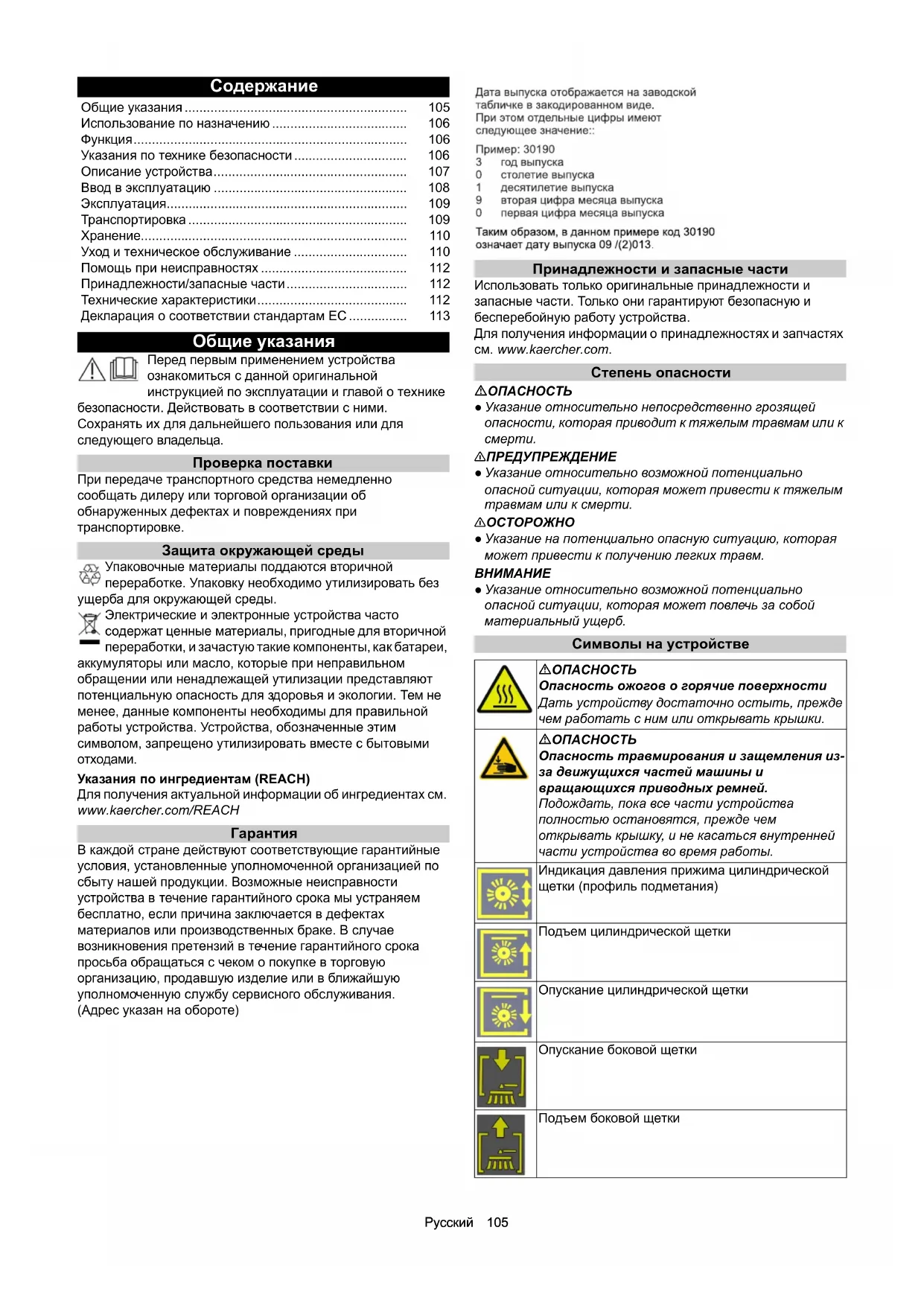 Опасность травмирования и защемления из- за движущихся частей машины и вращающихся приводных ремней. Подождать, пока все части устройства полностью остановятся, прежде чем открывать крышку, и не касаться внутренней части устройства во время работы. Индикация давления прижима цилиндрической щетки (профиль подметания) Подъем цилиндрической щетки Опускание цилиндрической щетки Опускание боковой щетки Подъем боковой щетки106 Русский Использование по назначению Эта подметальная машина с питанием от батареи предназначена для очистка ковров и различных текстильных полов в помещениях. Она оснащена антистатической цилиндрической щеткой и встроенным пылевым фильтром. Это устройство предназначено только для сухого применения. Подметальная машина предусмотрена для профессионального использования. Использовать подметающую машину исключительно в соответствии с указаниями, содержащими в данной инструкции по эк сплуатации. Любой другой вид использования устройства считается использованием не по назначению. Производитель устройства не несет ответственности за вред, причиненный вследствие подобного использования. Риск за подобное использование несет исключительно пользователь. Запрещается производить какие-либо модификации подметальной машины. Устройство разрешается перемещать с целью очистки только по поверхностям, разрешенным предприятием или его уполномоченным лиц