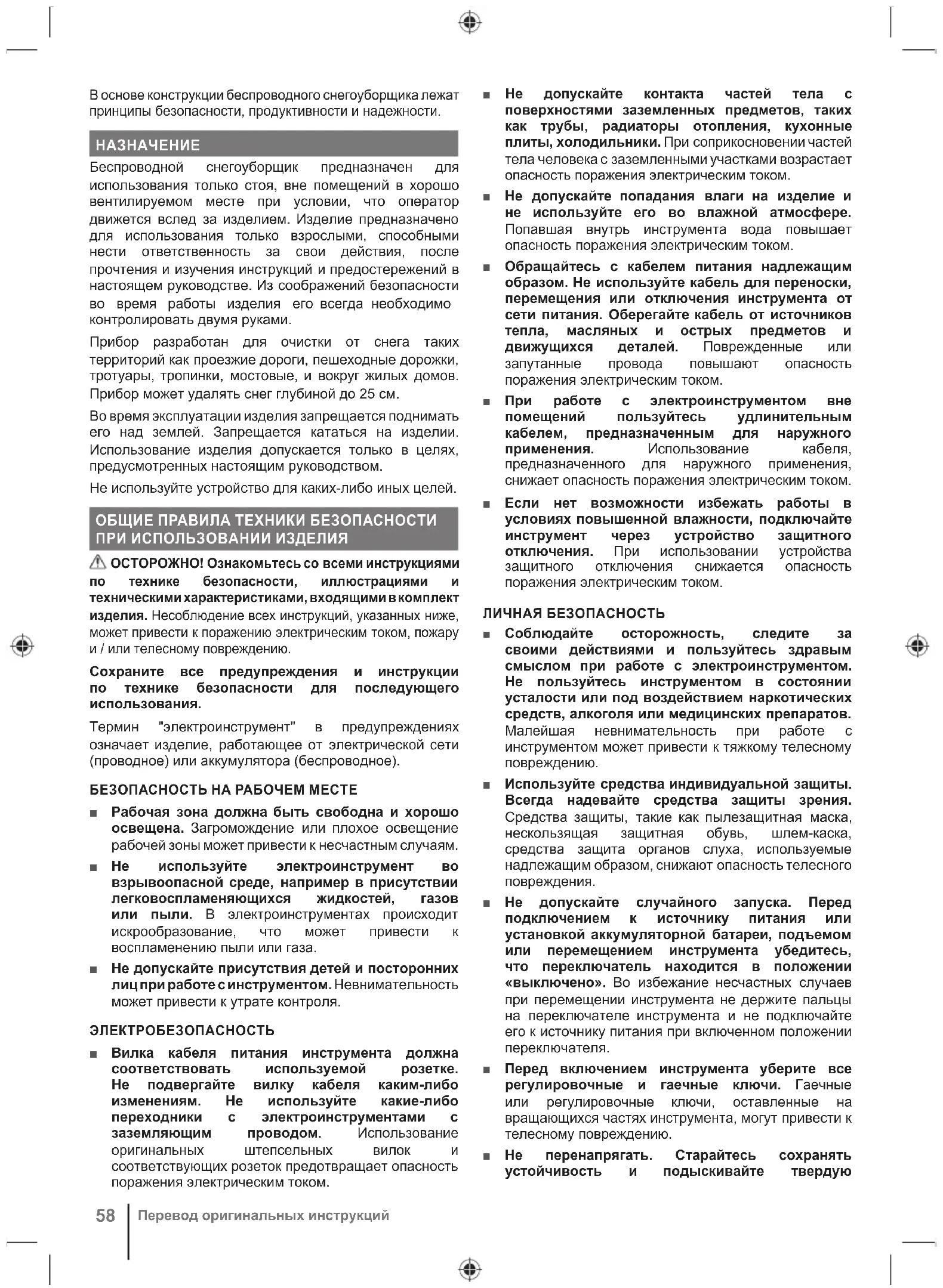 Беспроводной снегоуборщик предназначен для использования только стоя, вне помещений в хорошо вентилируемом месте при условии, что оператор движется вслед за изделием. Изделие предназначено для использования только взрослыми, способными нести ответственность за свои действия, после прочтения и изучения инструкций и предостережений в настоящем руководстве. Из соображений безопасности во время работы изделия его всегда необходимо контролировать двумя руками. Прибор разработан для очистки от снега таких территорий как проезжие дороги, пешеходные дорожки, тротуары, тропинки, мостовые, и вокруг жилых домов. Прибор может удалять снег глубиной до 25 см. Во время эксплуатации изделия запрещается поднимать его над землей. Запрещается кататься на изделии. Использование изделия допускается только в целях, предусмотренных настоящим руководством. Не используйте устройство для каких-либо иных целей. ОБЩИЕ ПРАВИЛА ТЕХНИКИ БЕЗОПАСНОСТИ ПРИ ИСПОЛЬЗОВАНИИ ИЗДЕЛИЯ ОСТОРОЖНО! Ознакомьтесь со всеми инструкциями по технике безопасности, иллюстрациями и техническими характеристиками, входящими в комплект изделия. Несоблюдение всех инструкций, указанных ниже, может привести к поражению электрическим током, пожару и / или телесному повреждению. Сохраните все предупреждения и инструкции по технике безопасности для последующего использования. Термин "электроинструмент" в предупреждениях означает изделие, работающее от электрической сети (проводное) или аккумулятора (беспроводное). БЕЗОПАСНОСТЬ НА РАБОЧЕМ МЕСТЕ ■ Рабочая зона должна быть свободна и хорошо освещена. Загромождение или плохое освещение рабочей зоны может привести к несчастным случаям. ■ Не используйте электроинструмент во взрывоопасной среде, например в присутствии легковоспламеняющихся жидкостей, газов или пыли. В электроинструментах происходит искрообразование, что может привести к воспламенению пыли или газа. ■ Не допускайте присутствия детей и посторонних лиц при работе с инструментом. Невнимательность может привести к утрате контроля. ЭЛЕКТРОБЕЗОПАСНОСТЬ ■ Вилка кабеля питания инструмента должна соответствовать используемой розетке. Не подвергайте вилку кабеля каким-либо изменениям. Не используйте какие-либо переходники с электроинструментами с заземляющим проводом. Использование оригинальных штепсельных вилок и соответствующих розеток предотвращает опасность поражения электрическим током. ■ Не допускайте контакта частей тела с поверхностями заземленных предметов, таких как трубы, радиаторы отопления, кухонные плиты, холодильники. При соприкосновении частей тела человека с заземленными участками возрастает опасность поражения электрическим током. ■ Не допускайте попадания влаги на изделие и не используйте его во влажной атмосфере. Попавшая внутрь инструмента вода повышает опасность поражения электрическим током. ■ Обращайтесь с кабелем питания надлежащим образом. Не используйте кабель для переноски, перемещения или отключения инструмента от сети питания. Оберегайте кабель от источников тепла, масляных и острых предметов и движущихся деталей. Поврежденные или запутанные провода повышают опасность поражения электрическим током. ■ При работе с электроинструментом вне помещений пользуйтесь удлинительным кабелем, предназначенным дл