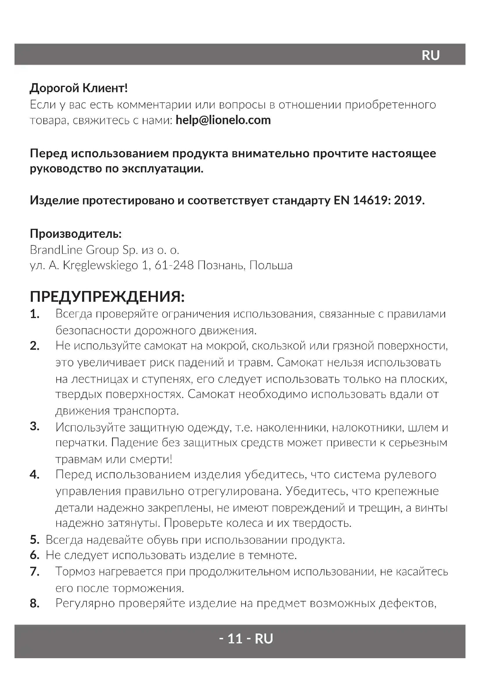 Дорогой Клиент! Если у вас есть комментарии или вопросы в отношении приобретенного товара, свяжитесь с нами: help@lionelo.com Перед использованием продукта внимательно прочтите настоящее руководство по эксплуатации. Изделие протестировано и соответствует стандарту EN 14619: 2019. Производитель: BrandLine Group Sp. из о. о. ул. A. Kręglewskiego 1, 61-248 Познань, Польша ПРЕДУПРЕЖДЕНИЯ: