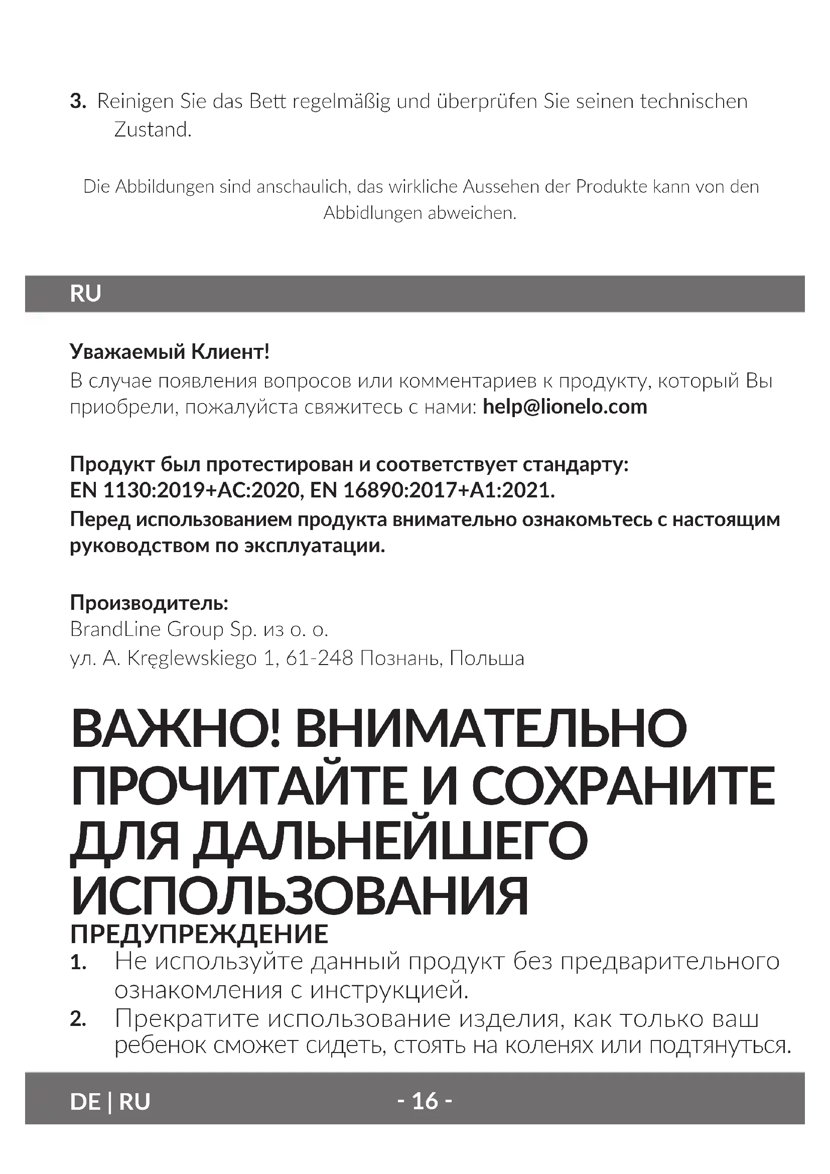 Das Polstermaterial kann man mit der Hand bei der maximalen Temperatur 30°C waschen.‑ 16 ‑ Уважаемый Клиент! В случае появления вопросов или комментариев к продукту, который Вы приобрели, пожалуйста свяжитесь с нами: help@lionelo.com Продукт был протестирован и соответствует стандарту: EN 1130:2019+AC:2020, EN 16890:2017+A1:2021. Перед использованием продукта внимательно ознакомьтесь с настоящим руководством по эксплуатации. Производитель: BrandLine Group Sp. из о. о. ул. A. Kręglewskiego 1, 61-248 Познань, Польша ВАЖНО! ВНИМАТЕЛЬНО ПРОЧИТАЙТЕ И СОХРАНИТЕ ДЛЯ ДАЛЬНЕЙШЕГО ИСПОЛЬЗОВАНИЯ ПРЕДУПРЕЖДЕНИЕ