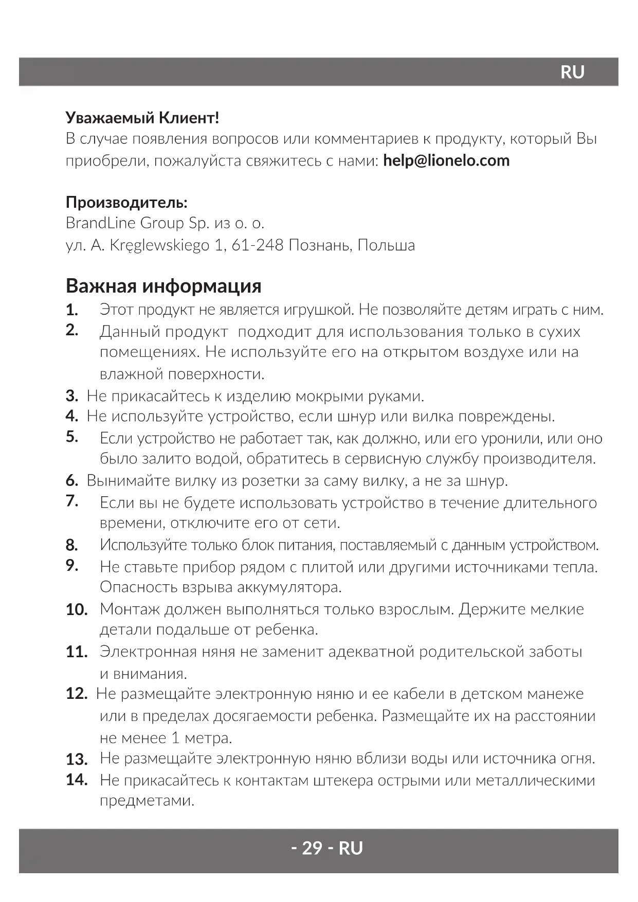 Уважаемый Клиент! В случае появления вопросов или комментариев к продукту, который Вы приобрели, пожалуйста свяжитесь с нами: help@lionelo.com Производитель: BrandLine Group Sp. из о. о. ул. A. Kręglewskiego 1, 61-248 Познань, Польша Важная информация