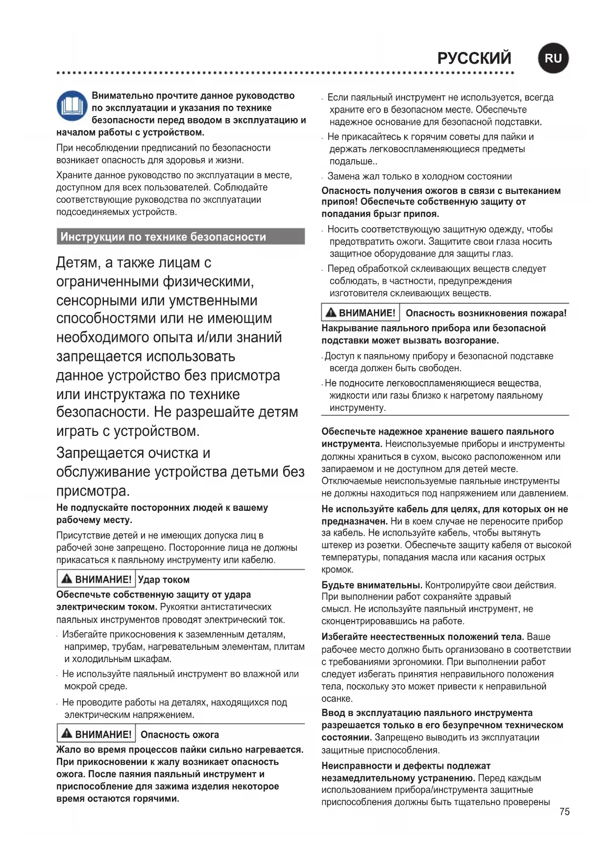 Не подпускайте посторонних людей к вашему рабочему месту. Присутствие детей и не имеющих допуска лиц в рабочей зоне запрещено. Посторонние лица не должны прикасаться к паяльному инструменту или кабелю.