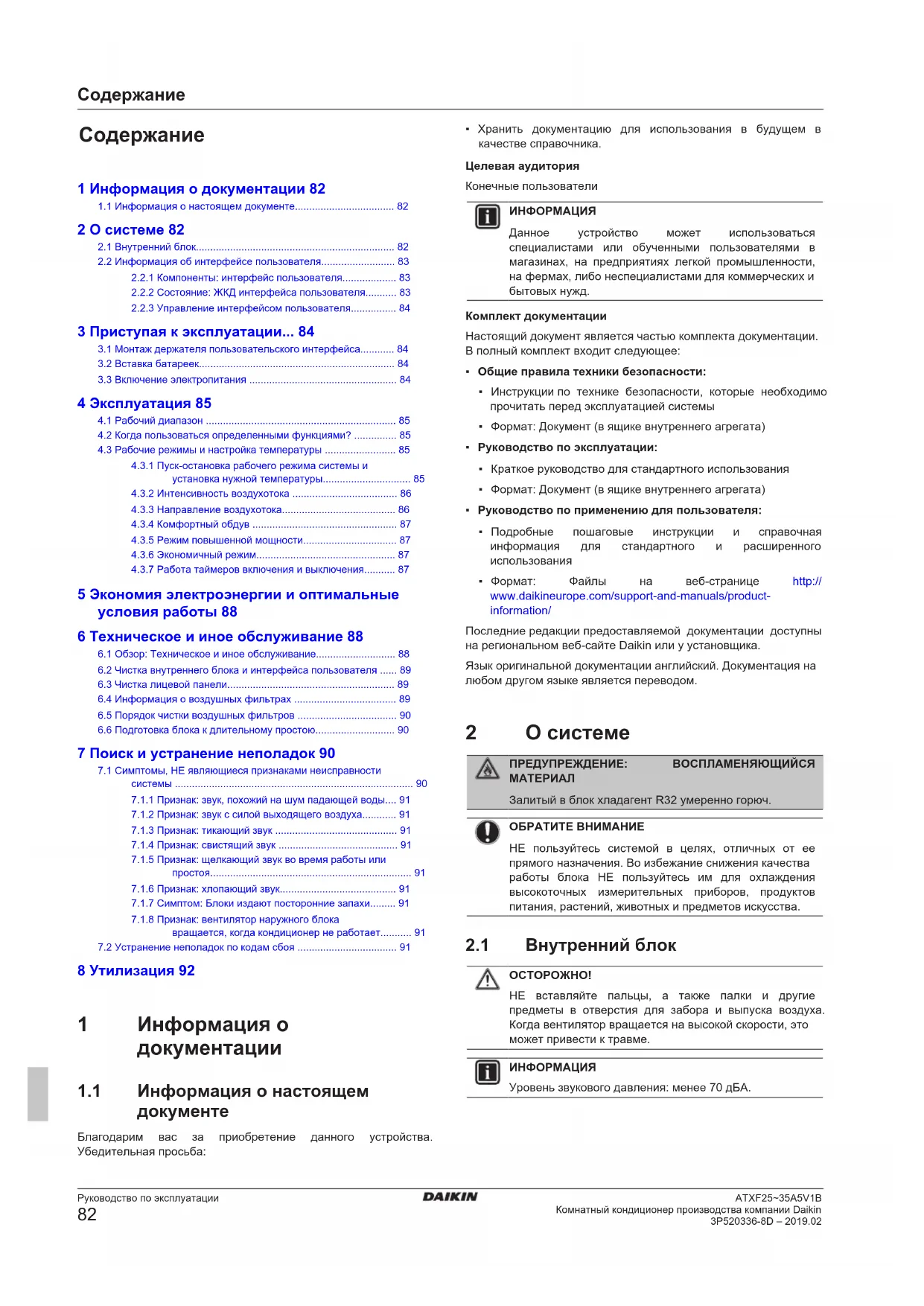 - Формат: Файлы на веб-странице http:// www.daikineurope.com/support-and-manuals/product- information/ Последние редакции предоставляемой документации доступны на региональном веб-сайте Daikin или у установщика. Язык оригинальной документации английский. Документация на любом другом языке является переводом. 2 О системе ПРЕДУПРЕЖДЕНИЕ: ВОСПЛАМЕНЯЮЩИЙСЯ