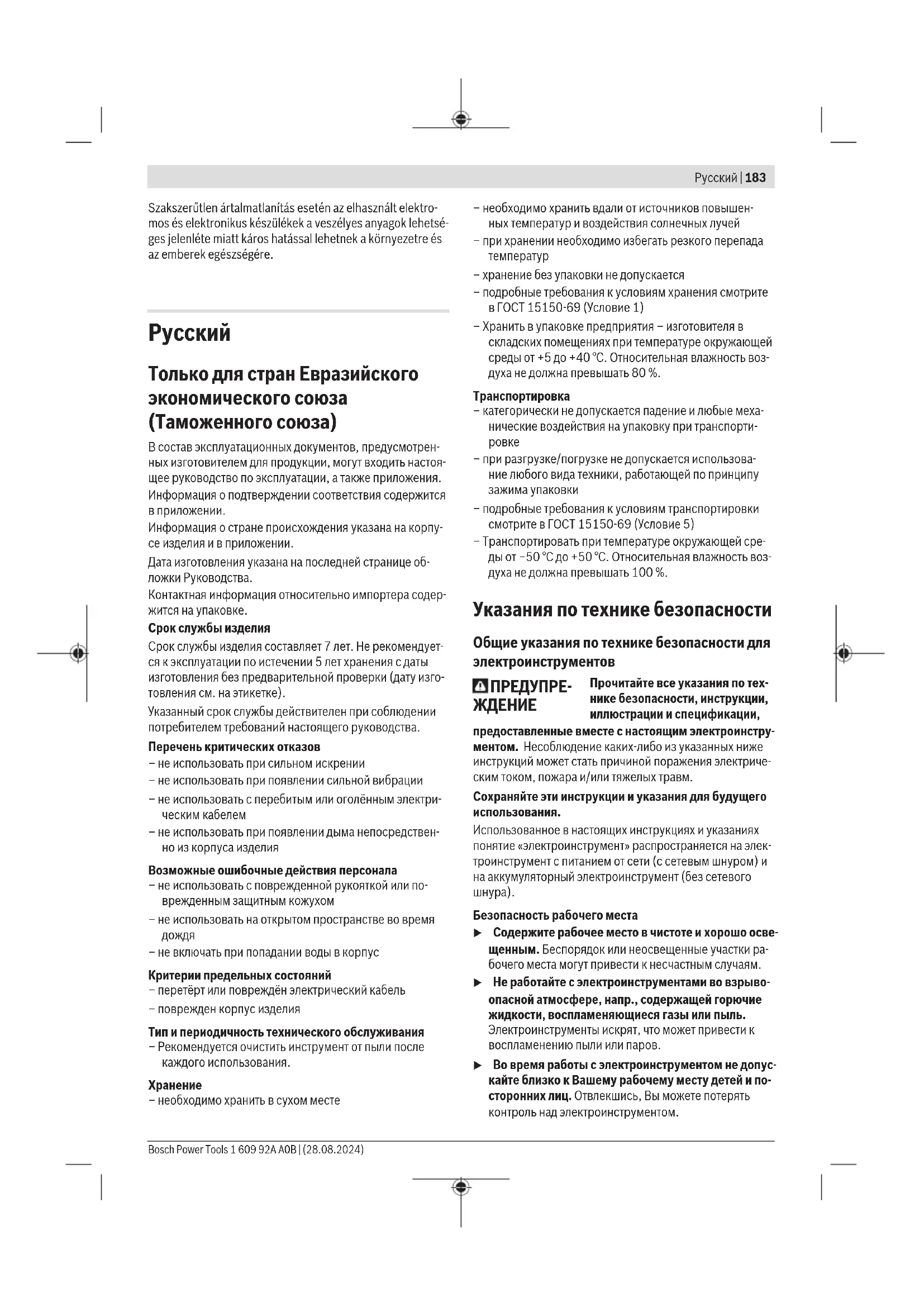 Безопасность рабочего места u Содержите рабочее место в чистоте и хорошо осве- щенным. Беспорядок или неосвещенные участки ра- бочего места могут привести к несчастным случаям. u Не работайте с электроинструментами во взрыво- опасной атмосфере, напр., содержащей горючие жидкости, воспламеняющиеся газы или пыль. Электроинструменты искрят, что может привести к воспламенению пыли или паров. u Во время работы с электроинструментом не допус- кайте близко к Вашему рабочему месту детей и по- сторонних лиц. Отвлекшись, Вы можете потерять контроль над электроинструментом. Bosch Power Tools 1 609 92A A0B | (28.08.2024)184 | Русский u Оборудование предназначено для работы в бытовых условиях, коммерческих зонах и общественных ме- стах, производственных зонах с малым электропо- треблением, без воздействия вредных и опасных производственных факторов. Оборудование предна- значено для эксплуатации без постоянного присут- ствия обсуживающего персонала. Электробезопасность u Штепсельная вилка электроинструмента должна подходить к штепсельной розетке. Ни в коем слу- чае не вносите изменения в штепсельную вилку. Не применяйте переходные штекеры для элек- троинструментов с защитным заземлением. Неиз- мененные штепсельные вилки и подходящие штепсельные розетки снижают риск поражения элек-