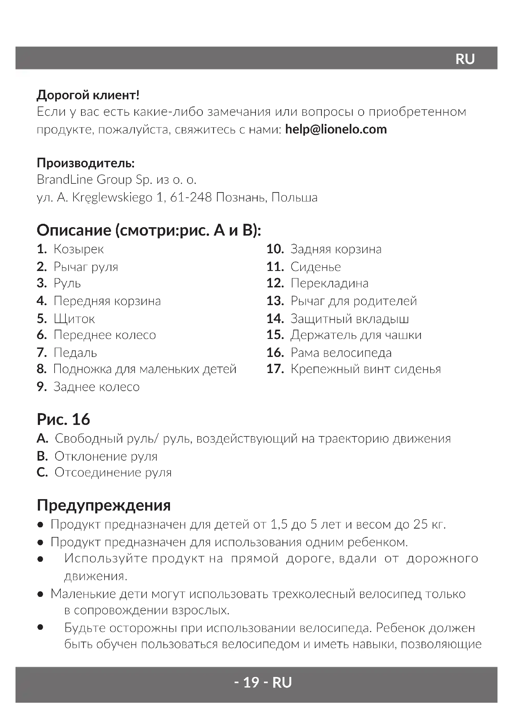 Дорогой клиент! Если у вас есть какие-либо замечания или вопросы о приобретенном продукте, пожалуйста, свяжитесь с нами: help@lionelo.com Производитель: BrandLine Group Sp. из о. о. ул. A. Kręglewskiego 1, 61-248 Познань, Польша Oписание (смотри:рис. A и B):