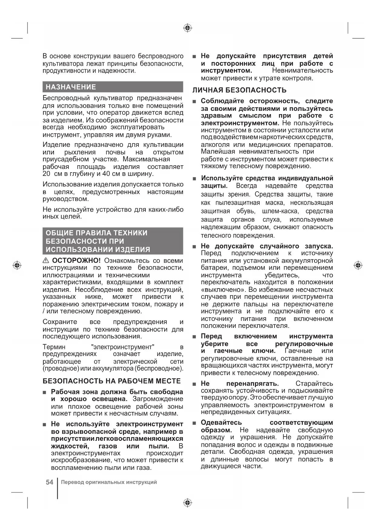 Беспроводный культиватор предназначен для использования только вне помещений при условии, что оператор движется вслед за изделием. Из соображений безопасности всегда необходимо эксплуатировать инструмент, управляя им двумя руками. Изделие предназначено для культивации или рыхления почвы на открытом приусадебном участке. Максимальная рабочая площадь изделия составляет 20 см в глубину и 40 см в ширину. Использование изделия допускается только в целях, предусмотренных настоящим руководством. Не используйте устройство для каких-либо иных целей. ОБЩИЕ ПРАВИЛА ТЕХНИКИ БЕЗОПАСНОСТИ ПРИ ИСПОЛЬЗОВАНИИ ИЗДЕЛИЯ ОСТОРОЖНО! Ознакомьтесь со всеми инструкциями по технике безопасности, иллюстрациями и техническими характеристиками, входящими в комплект изделия. Несоблюдение всех инструкций, указанных ниже, может привести к поражению электрическим током, пожару и / или телесному повреждению. Сохраните все предупреждения и инструкции по технике безопасности для последующего использования. Термин "электроинструмент" в предупреждениях означает изделие, работающее от электрической сети (проводное) или аккумулятора (беспроводное). БЕЗОПАСНОСТЬ НА РАБОЧЕМ МЕСТЕ ■ Рабочая зона должна быть свободна и хорошо освещена. Загромождение или плохое освещение рабочей зоны может привести к несчастным случаям. ■ Не используйте электроинструмент во взрывоопасной среде, например в присутствии легковоспламеняющихся жидкостей, газов или пыли. В электроинструментах происходит искрообразование, что может привести к воспламенению пыли или газа. ■ Не допускайте присутствия детей и посторонних лиц при работе с инструментом. Невнимательность может привести к утрате контроля. ЛИЧНАЯ БЕЗОПАСНОСТЬ ■ Соблюдайте осторожность, следите за своими действиями и пользуйтесь здравым смыслом при работе с электроинструментом. Не пользуйтесь инструментом в состоянии усталости или под воздействием наркотических средств, алкоголя или медицинских препаратов. Малейшая невнимательность при работе с инструментом может привести к тяжкому телесному повреждению. ■ Используйте средства индивидуальной защиты. Всегда надевайте средства защиты зрения. Средства защиты, такие как пылезащитная маска, нескользящая защитная обувь, шлем-каска, средства защита органов слуха, используемые надлежащим образом, снижают опасность телесного повреждения. ■ Не допускайте случайного запуска. Перед подключением к источнику питания или установкой аккумуляторной батареи, подъемом или перемещением инструмента убедитесь, что переключатель находится в положении «выключено». Во избежание несчастных случаев при перемещении инструмента не держите пальцы на переключателе инструмента и не подключайте его к источнику питания при включенном положении переключателя. ■ Перед включением инструмента уберите все регулировочные и гаечные ключи. Гаечные или регулировочные ключи, оставленные на вращающихся частях инструмента, могут привести к телесному повреждению. ■ Не перенапрягать. Старайтесь сохранять устойчивость и подыскивайте твердую опору. Это обеспечивает лучшую управляемость электроинструментом в непредвиденных ситуациях. ■ Одевайтесь соответствующим образом. Не надевайте свободную одежду и украшения. Не допускайте попадания волос и одежды в подвижные детали. Своб