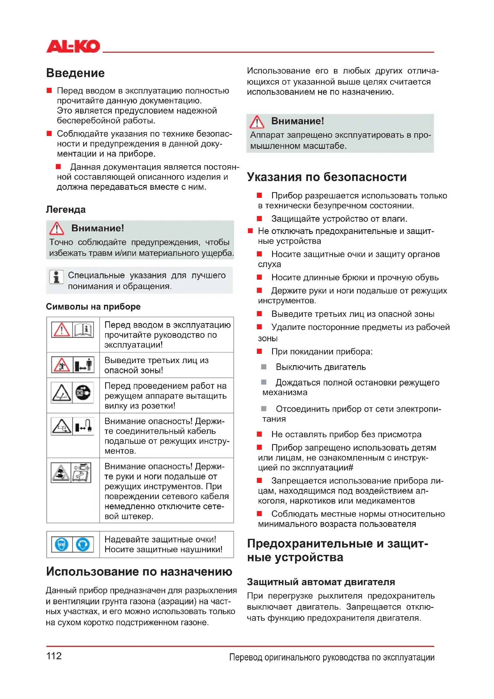 Внимание опасность! Держи- те руки и ноги подальше от режущих инструментов. При повреждении сетевого кабеля немедленно отключите сете- вой штекер. Надевайте защитные очки! Носите защитные наушники! Использование по назначению Данный прибор предназначен для разрыхления и вентиляции грунта газона (аэрации) на част- ных участках, и его можно использовать только на сухом коротко подстриженном газоне. Использование его в любых других отлича- ющихся от указанной выше целях считается использованием не по назначению.