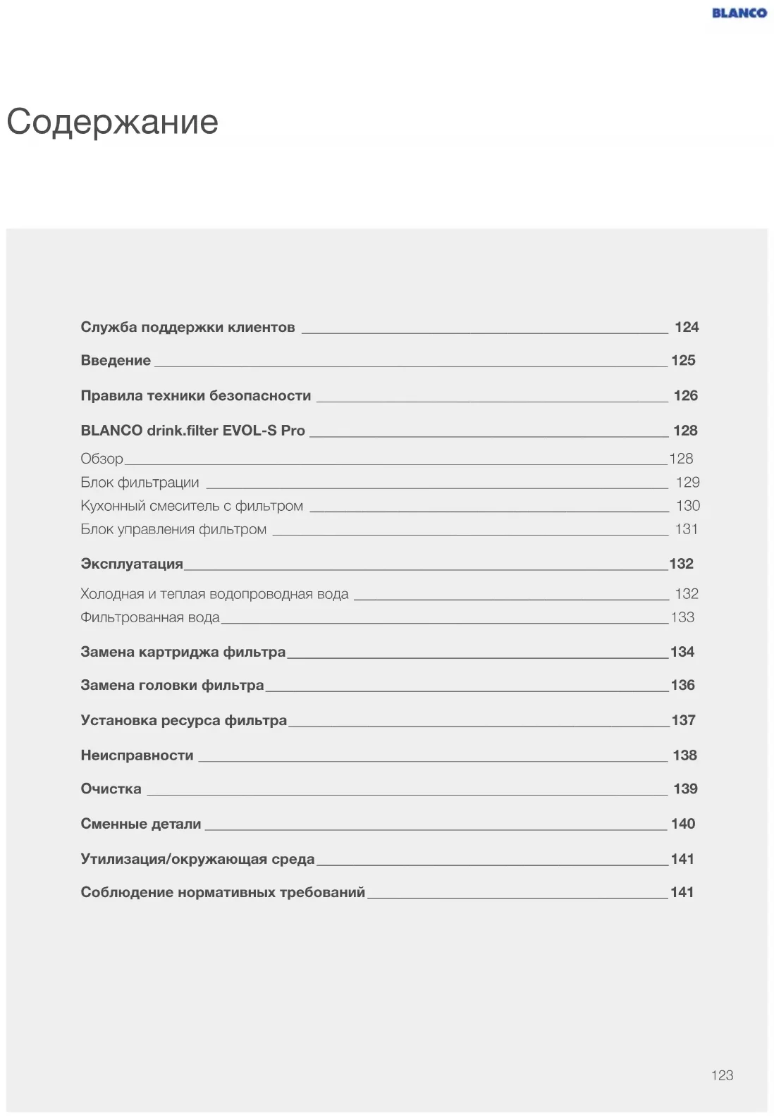 Części wymienne 120Utylizacja/środowisko Prawidłowa utylizacja starych urządzeń (odpady elektroniczne) (w krajach UE iinnych krajach europejskich z oddzielnym systemem zbiórki). Etykiety naprodukcie, częściach akcesoriów i dołączonej do nich dokumentacji wskazują, żeproduktu i akcesoriów nie należy wyrzucać wraz ze zwykłymi odpadami domowymi po upływie ich przydatności do użycia. Prosimy zutylizować to urządzenie i jego akcesoria oddzielnie od innych odpadów, aby uniknąć szkód dlaśrodowiska lub zdrowia ludzkiego w wyniku niekontrolowanej utylizacji. Utylizując stare urządzenia i ich akcesoria we właściwy sposób, użytkownik przyczynia się do przyjaznego dla środowiska recyklingu zasobów. Prywatni użytkownicy powinni skontaktować się ze dealerem, uktórego kupili produkt, lub z odpowiednimi władzami, aby dowiedzieć się, gdzie mogą oddać stare urządzenie i akcesoria, aby zutylizować produkt w sposób przyjazny dlaśrodowiska. Użytkownicy komercyjni powinni skontaktować się ze swoimi dostawcami i postępować zgodnie zwarunkami umowy sprzedaży. Ten produkt oraz elektroniczne komponenty akcesoriów nie mogą byćutylizowane razem z innymi odpadami komercyjnymi. Zgodność System spełnia wymagania odpowiednich dyrektyw. Deklarację zgodności można uzyskać od firmy BLANCO. 121122Содержание Служба поддержки клиентов 124 Введение 125 Правила техники безопасности 126 BLANCO drink.filter EVOL-S Pro 128 Обзор __________________________________________________________________________ 128 Блок фильтрации _______________________________________________________________ 129 Кухонный смеситель с фильтром _________________________________________________ 130 Блок управления фильтром ______________________________________________________ 131 Эксплуатация 132 Холодная и теплая водопроводная вода ___________________________________________ 132 Фильтрованная вода _____________________________________________________________ 133 Замена картриджа фильтра 134 Замена головки фильтра 136 Установка ресурса фильтра 137 Неисправности 138 Очистка 139 Сменные детали 140 Утилизация/окружающая среда 141 Соблюдение нормативных требований 141 123Служба поддержки клиентов Мы надеемся, что эксплуатация нашей системы станет для вас настоящим удовольствием. Наше руководство по эксплуатации составлено так, чтобы у вас невозникло никаких проблем при использовании системы BLANCO Filter. Если у вас возникнут вопросы, свяжитесь с нашей службой поддержки клиентов BLANCO. Тел.: +7 (495) 229-30-15 Вы также можете написать нам. Воспользуйтесь контактной формой на нашем сайте: www.blanco.com 124Введение Система BLANCO Filter фильтрует водопроводную воду. Результат:питьевая вода с прекрасным вкусом. Обычная водопроводная вода и фильтрованная водопроводная вода подаются через дваотдельных излива на кухонном смесителе. Система была разработана для частного использования, как правило, на кухне. Но ее также можно использовать ивобщественных местах, таких как офис или медицинский кабинет. Такое использование повлечет за собой дополнительные требования к чистке и техническому обслуживанию, за которые ответственность несет пользователь. Любое использование, выходящее за рамки предусмотренного, или использование для других целей считается использованием не по назначению. Компания BLANCO не несет ответственности за ущерб, возникшийв результате использования не по назначению. Настоящее руководство пользователя знакомит вас ссистемой и объясняет все ее функции. Внимательно прочтите руководство по эксплуатации, в частности предупреждения по технике безопасности, и храните их вместе с устройством. Схемы иописания предоставлены для облегчения понимания. Некоторыедетали смесителя могут отличаться отпредставленныхна иллюстрациях. Информация и требования по установке приведены в отдельной инструкции по установке. Если вы хотите установить устройство вдругом месте или у вас больше нет копии инструкций поустановке, обратитесь в службу поддержки клиентов BLANCO. 125Правила техники безопасности Этим устройством могут пользоваться дети в возра