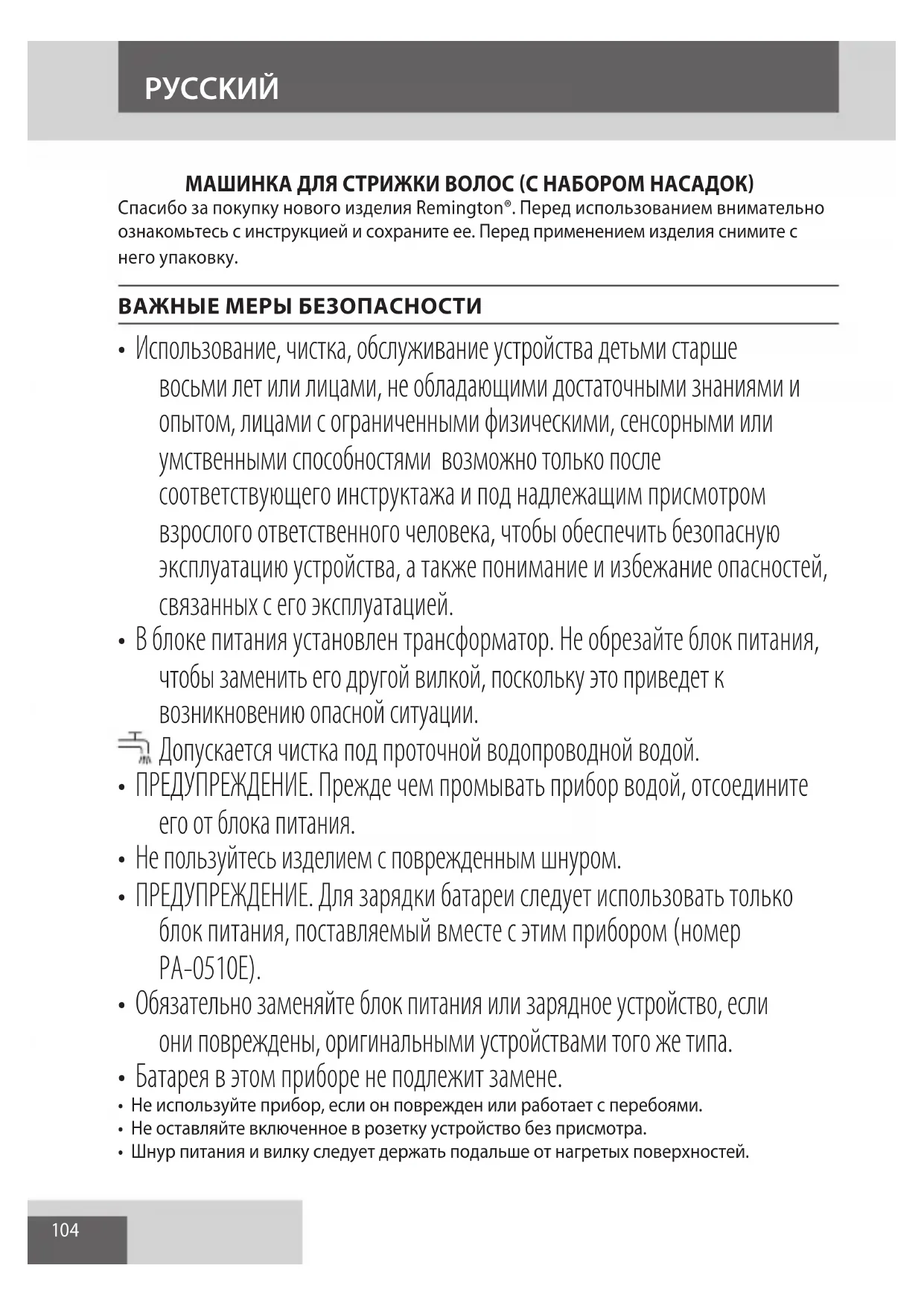 AE104 МАШИНКА ДЛЯ СТРИЖКИ ВОЛОС (C НАБОРОМ НАСАДОК) Спасибо за покупку нового изделия Remington®. Перед использованием внимательно ознакомьтесь с инструкцией и сохраните ее. Перед применением изделия снимите с него упаковку. ВАЖНЫЕ МЕРЫ БЕЗОПАСНОСТИ