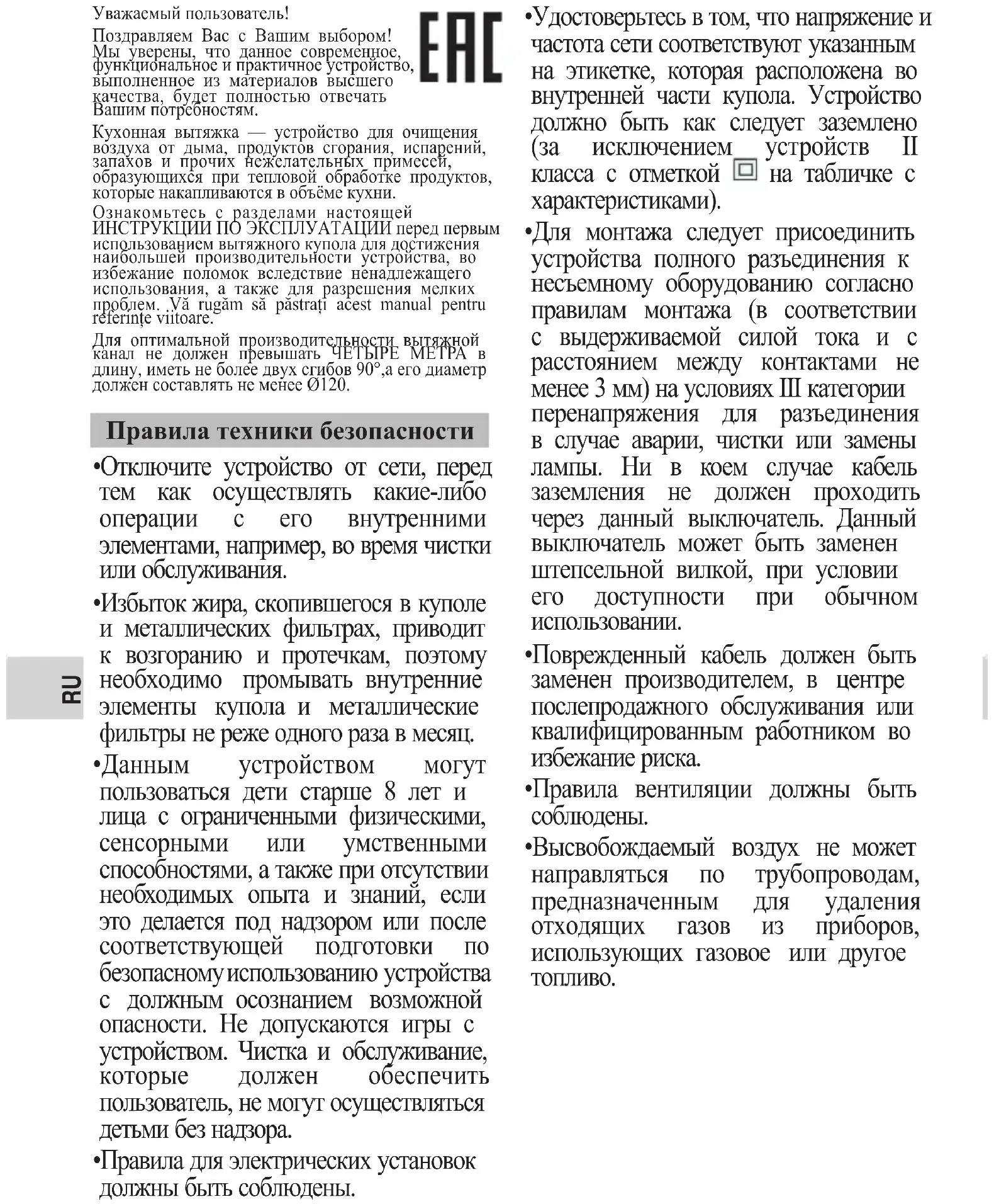 Уважаемый пользователь! Поздравляем Вас с Вашим выбором! Мы уверены, что данное современное, функциональное и практичное устройство, выполненное из материалов высшего качества, будет полностью отвечать Вашим потребностям. Кухонная вытяжка — устройство для очищения воздуха от дыма, продуктов сгорания, испарений, запахов и прочих нежелательных примесей, образующихся при тепловой обработке продуктов, которые накапливаются в объёме кухни. Ознакомьтесь с разделами настоящей ИНСТРУКЦИИ ПО ЭКСПЛУАТАЦИИ перед первым использованием вытяжного купола для достижения наибольшей производительности устройства, во избежание поломок вследствие ненадлежащего использования, а также для разрешения мелких проблем. Vă rugăm să păstrați acest manual pentru referințe viitoare. Для оптимальной производительности вытяжной канал не должен превышать ЧЕТЫРЕ МЕТРА в длину, иметь не более двух сгибов 90°,а его диаметр должен составлять не менее Ø120.