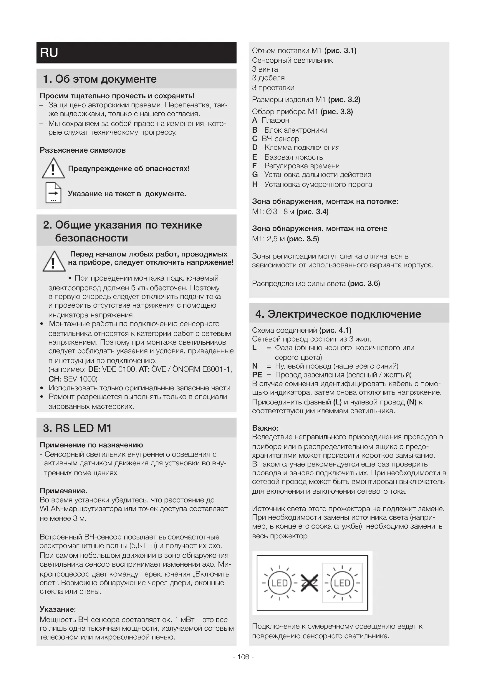 CN- 106 - Объем поставки М1 (рис.3.1) Сенсорный светильник 3 винта 3 дюбеля 3 проставки Размеры изделия М1 (рис.3.2) Обзор прибора М1 (рис.3.3) A Плафон B Блок электроники C ВЧ-сенсор D Клемма подключения Е Базовая яркость F Регулировка времени G Установка дальности действия H Установка сумеречного порога Зона обнаружения, монтаж на потолке: M1: Ø 3 – 8 м (рис.3.4) Зона обнаружения, монтаж на стене M1: 2,5 м (рис.3.5) Зоны регистрации могут слегка отличаться в зависимости от использованного варианта корпуса. Распределение силы света (рис.3.6)