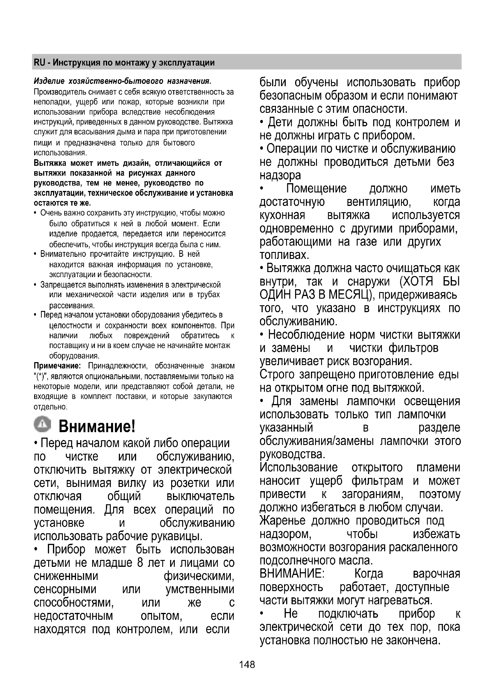 - Для замены лампочки освещения использовать только тип лампочки указанный в разделе обслуживания/замены лампочки этого руководства. Использование открытого пламени наносит ущерб фильтрам и может привести к загораниям, поэтому должно избегаться в любом случаи. Жаренье должно проводиться под надзором, чтобы избежать возможности возгорания раскаленного подсолнечного масла. ВНИМАНИЕ: Когда варочная поверхность работает, доступные части вытяжки могут нагреваться.