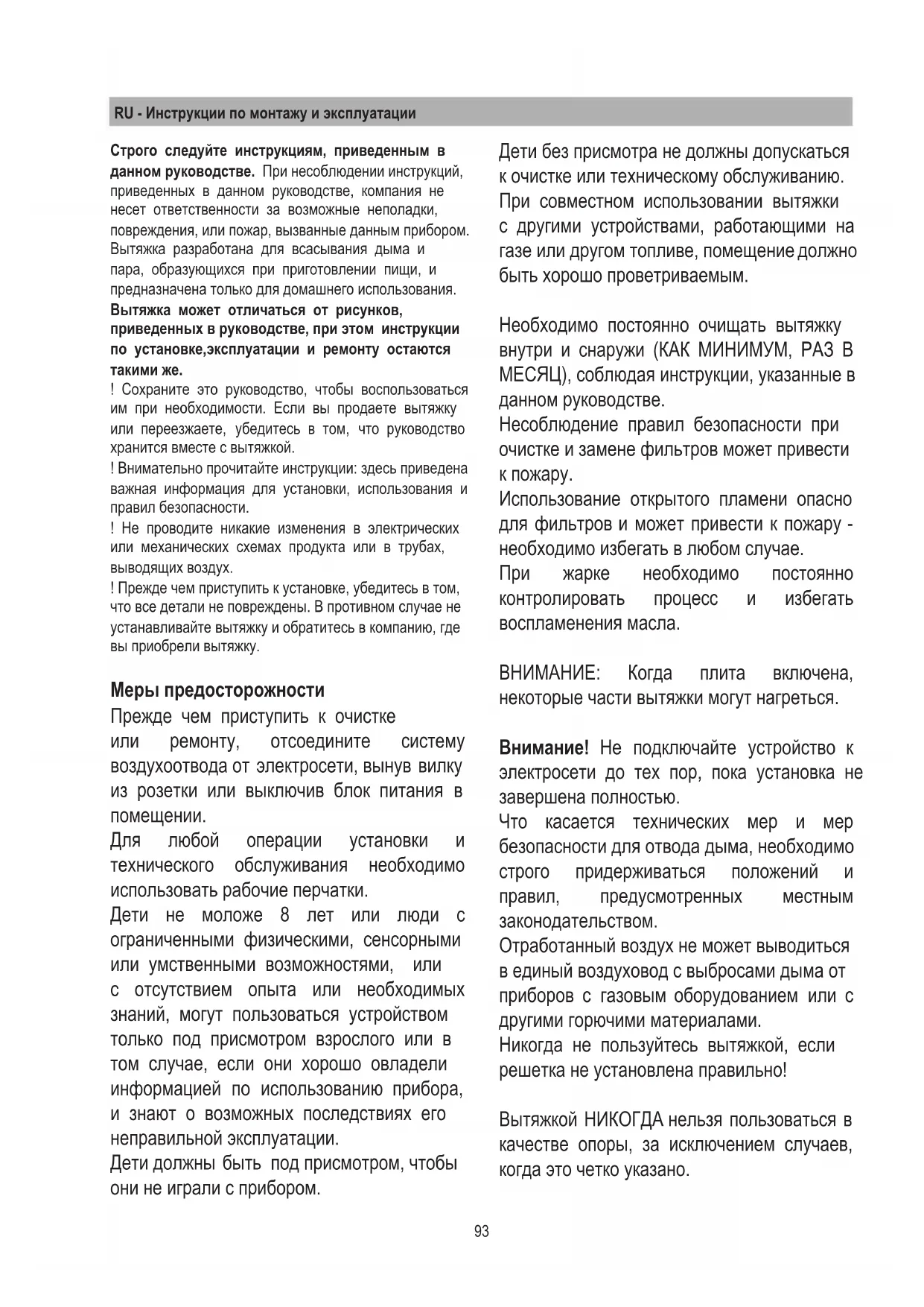 Для любой операции установки и технического обслуживания необходимо использовать рабочие перчатки. Дети не моложе 8 лет или люди с ограниченными физическими, сенсорными или умственными возможностями, или с отсутствием опыта или необходимых знаний, могут пользоваться устройством только под присмотром взрослого или в том случае, если они хорошо овладели информацией по использованию прибора, и знают о возможных последствиях его неправильной эксплуатации. Дети должны быть под присмотром, чтобы они не играли с прибором. Дети без присмотра не должны допускаться к очистке или техническому обслуживанию. При совместном использовании вытяжки с другими устройствами, работающими на газе или другом топливе, помещение должно быть хорошо проветриваемым. Необходимо постоянно очищать вытяжку внутри и снаружи (КАК МИНИМУМ, РАЗ В МЕСЯЦ), соблюдая инструкции, указанные в данном руководстве. Несоблюдение правил безопасности при очистке и замене фильтров может привести