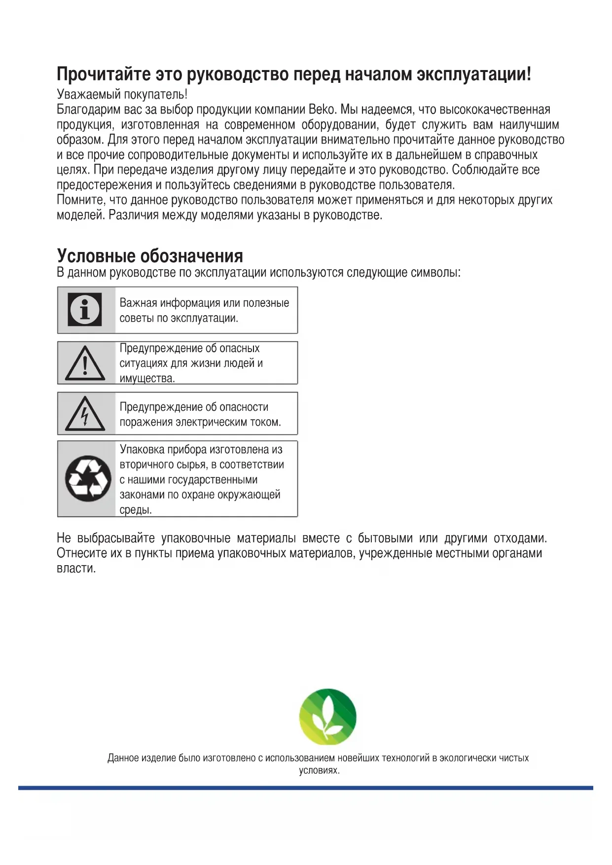 - Při výměně kontaktujte technickou podporu. („Přinákupukontaktujtetechnickoupodporu“)Прочитайте это руководство перед началом эксплуатации! Уважаемый покупатель! Благодарим вас за выбор продукции компании Beko. Мы надеемся, что высококачественная продукция, изготовленная на современном оборудовании, будет служить вам наилучшим образом. Для этого перед началом эксплуатации внимательно прочитайте данное руководство и все прочие сопроводительные документы и используйте их в дальнейшем в справочных целях. При передаче изделия другому лицу передайте и это руководство. Соблюдайте все предостережения и пользуйтесь сведениями в руководстве пользователя. Помните, что данное руководство пользователя может применяться и для некоторых других моделей. Различия между моделями указаны в руководстве. Условные обозначения В данном руководстве по эксплуатации используются следующие символы: