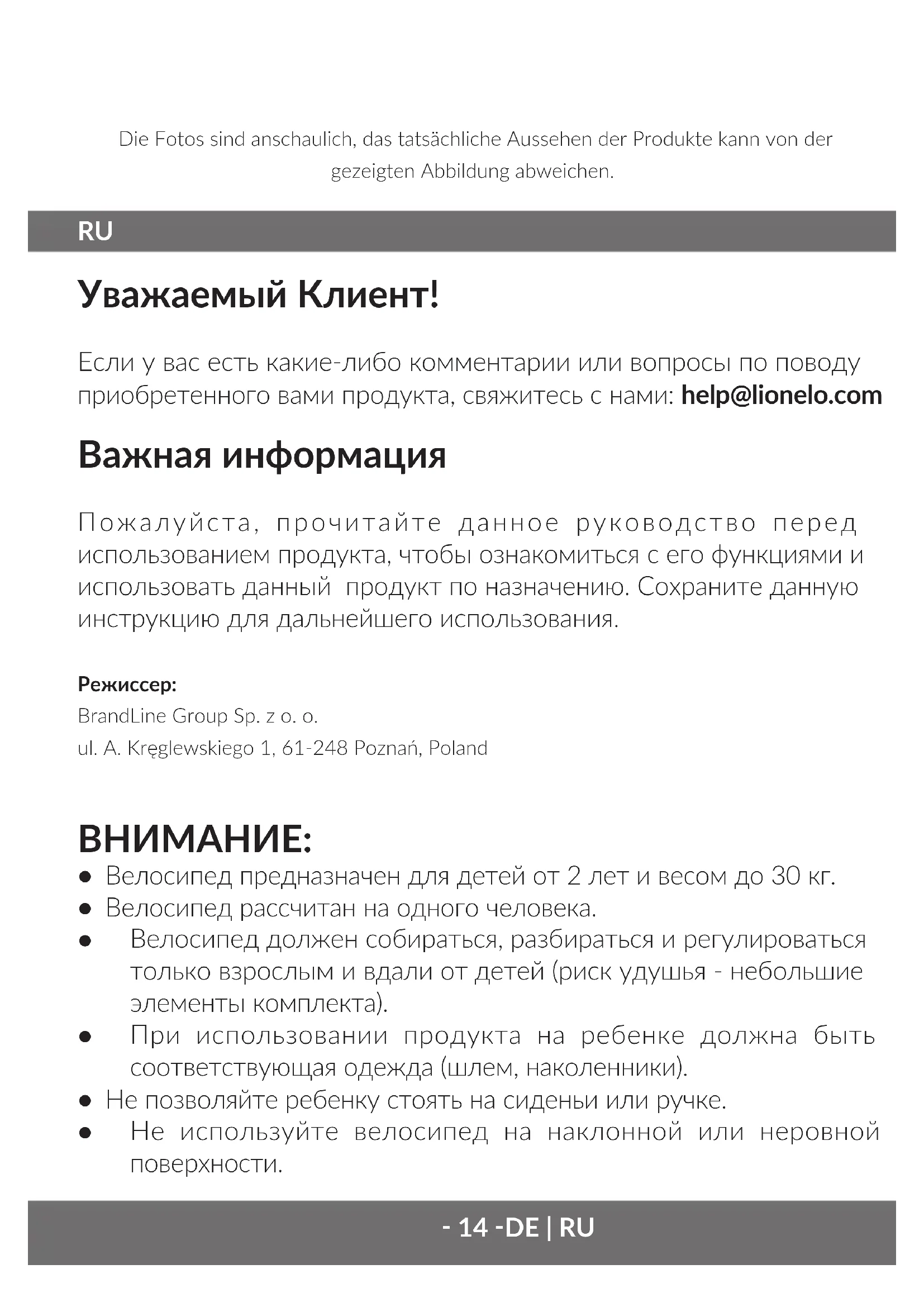 Пропустите шток (A) через отверстие в вилке велосипеда, а затем через втулку (B), колесо (C), вторую втулку (B) и второе отверстие в вилке. Затяните гайку оси (D) с помощью шестигранного ключа. Сборка обоих велосипедных колес осуществляется одинаково. Перед использованием убедитесь, что все крепежные детали надежно затянуты. Использование Следует сесть на сиденье, крепко взяться за обе ручки руля, а затем попеременно оттолкнуться ногами от земли. После ускорения поднять ноги, чтобы свободно двигаться. Таким образом, ребенок должен научиться балансировать. Поворот осуществляется путем поворота рулевого колеса в направлении поворота и балансировки тела. Торможение следует проводить, касаясь земли ногами. Обслуживание и чистка Помойте велосипед влажной тканью и вытрите насухо. Не используйте едкие или абразивные моющие средства. Продукт прошел тесты и соответствует следующим нормам: EN 71-1:2014+A1:2018, EN 71-2:2020, EN 71-3:2019+A1:2021 Изображения, представленные в инструкции, могут отличаться от действительных.‑ 18 ‑IT Genle Cliente! Se hai commen o domande su un prodoo acquistato, contaaci: help@lionelo.com Informazioni importan Si prega di leggere questo manuale prima di ulizzare il prodoo per scoprire le sue funzioni e ulizzarlo per lo scopo previsto. Conservare queste istruzioni per un uso futuro. Produore: BrandLine Group Sp. z o. o. ul. A. Kręglewskiego 1, 61-248 Poznań, Poland Avvermen: