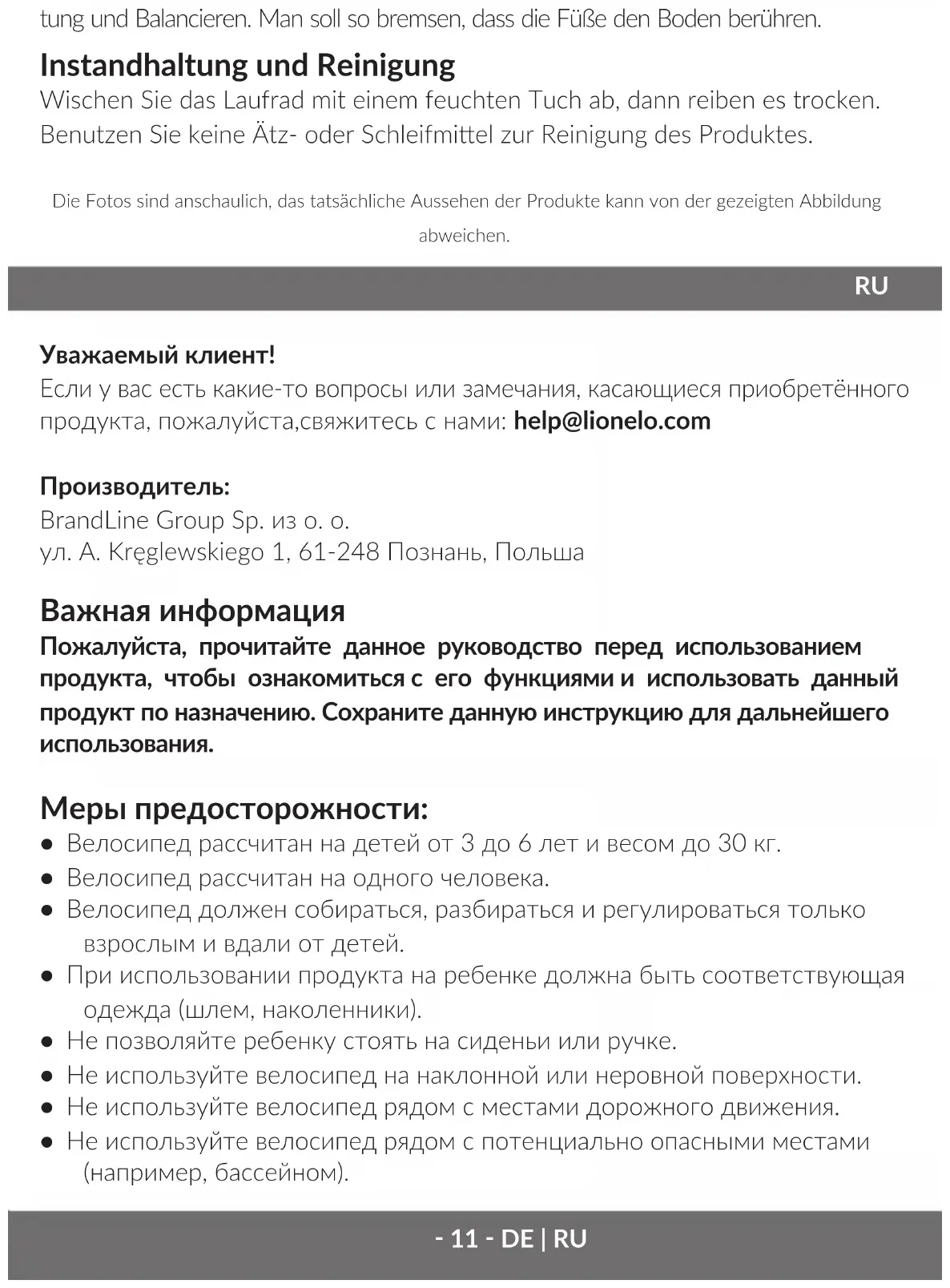 Уважаемый клиент! Если у вас есть какие-то вопросы или замечания, касающиеся приобретённого продукта, пожалуйста,свяжитесь с нами: help@lionelo.com Производитель: BrandLine Group Sp. из о. о. ул. A. Kręglewskiego 1, 61-248 Познань, Польша Важная информация Пожалуйста, прочитайте данное руководство перед использованием продукта, чтобы ознакомиться с его функциями и использовать данный продукт по назначению. Сохраните данную инструкцию для дальнейшего использования. Меры предосторожности: