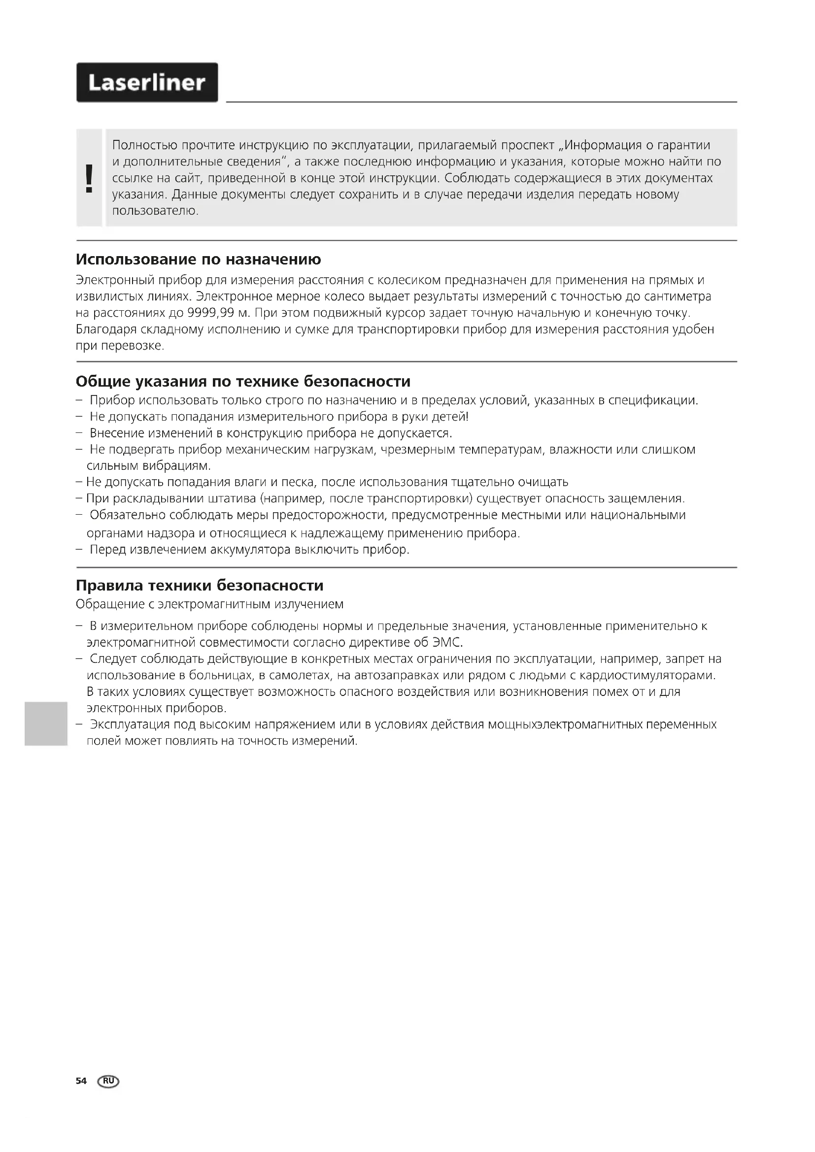 Использование по назначению Электронный прибор для измерения расстояния с колесиком предназначен для применения на прямых и извилистых линиях. Электронное мерное колесо выдает результаты измерений с точностью до сантиметра на расстояниях до 9999,99 м. При этом подвижный курсор задает точную начальную и конечную точку. Благодаря складному исполнению и сумке для транспортировки прибор для измерения расстояния удобен при перевозке. Общие указания по технике безопасности – Прибор использовать только строго по назначению и в пределах условий, указанных в спецификации. – Не допускать попадания измерительного прибора в руки детей! – Внесение изменений в конструкцию прибора не допускается. – Не подвергать прибор механическим нагрузкам, чрезмерным температурам, влажности или слишком сильным вибрациям. – Не допускать попадания влаги и песка, после использования тщательно очищать – При раскладывании штатива (например, после транспортировки) существует опасность защемления. – Обязательно соблюдать меры предосторожности, предусмотренные местными или национальными органами надзора и относящиеся к надлежащему применению прибора. – Перед извлечением аккумулятора выключить прибор. Правила техники безопасности Обращение с электромагнитным излучением – В измерительном приборе соблюдены нормы и предельные значения, установленные применительно к электромагнитной совместимости согласно директиве об ЭМС. – Следует соблюдать действующие в конкретных местах ограничения по эксплуатации, например, запрет на использование в больницах, в самолетах, на автозаправках или рядом с людьми с кардиостимуляторами. В таких условиях существует возможность опасного воздействия или возникновения помех от и для электронных приборов. – Эксплуатация под высоким напряжением или в условиях действия мощных электромагнитных переменных полей может повлиять на точность измерений.RollPilot D12
