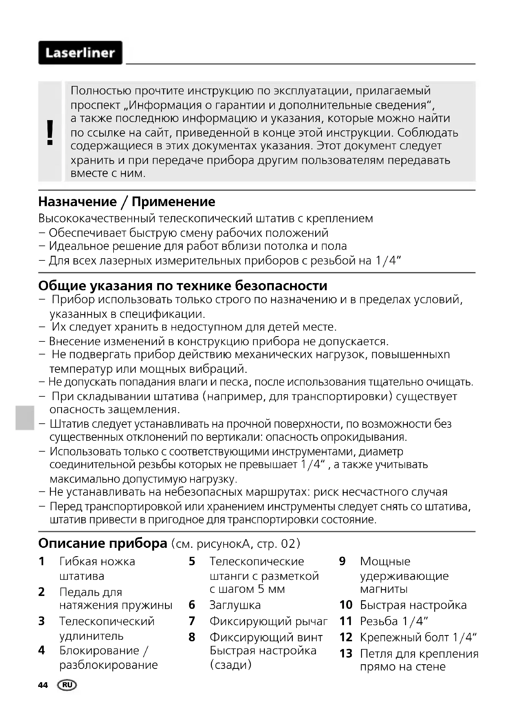 Просим ознакомиться и соблюдать наши дополнительные правила, которые можно найти по адресу http://laserliner.com/info?an=AJA Технические характеристики (Изготовитель сохраняет за собой права на внесение технических изменений. 19W31) Максимальная высота 330 см Минимальная высота 76 см Максимальная нагрузка 5 кг Рабочие условия -10°C … 50°C, Влажность воздуха макс. 85% rH, без образования конденсата Условия хранения -20°C … 70°C, Влажность воздуха макс. 80% rH Вес 2200 г (Включая, крепление) Размеры (Ш x В x Г) 200 x 800 x 200 мм Информация по обслуживанию и уходу Все компоненты очищать слегка влажной салфеткой; не использовать чистящие средства, абразивные материалы и растворители. Прибор хранить в чистом и сухом месте. RUTelePod Plus 330 cm