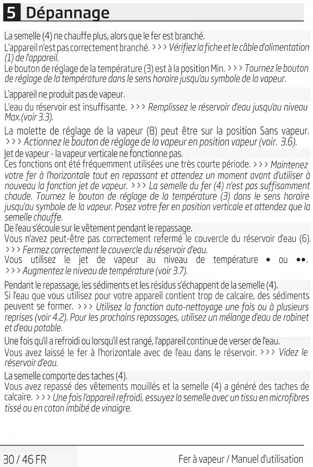 >>> Увеличьте температуру (см. 3.7). Во время глажки из подошвы (4) выпадают частицы накипи и грязи. Такие частицы могут образовываться, если вода, которую вы используете в своем электроприборе, слишком жесткая. >>> Используйте функцию самоочистки один или несколько раз (см. 4.2). Для последующей глажки заполните резервуар для воды смесью водопроводной и питьевой воды. При остывании электроприбора или во время хранения из него капает вода. Возможно, вы оставили электроприбор в горизонтальном положении с водой в резервуаре. >>> Опустошите резервуар для воды. Пятна на подошве (4). Возможно, вы гладили сырую одежду, а на подошве (4) были пятна накипи. >>> После того, как электроприбор остынет, вытрите подошву тряпочкой из микрофибры, трикотажа или хлопка, смоченной в уксусе.