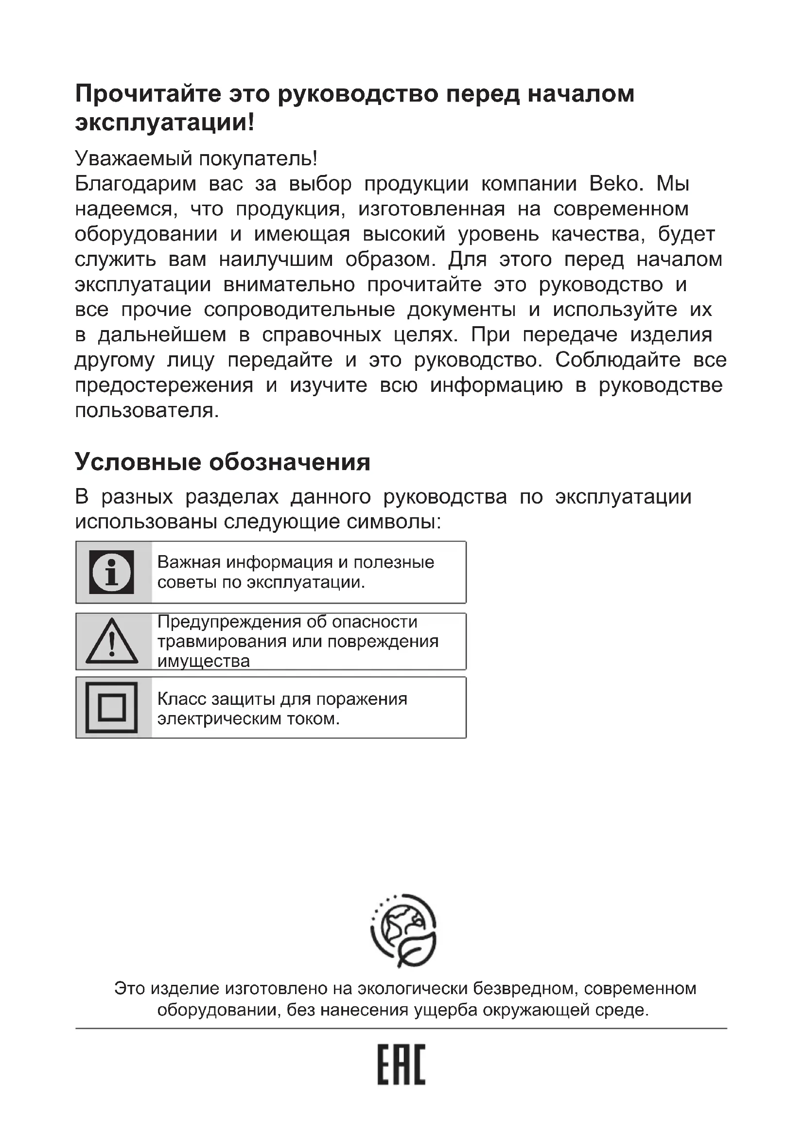 Тазалау және қызмет көрсетуПрочитайте это руководство перед началом эксплуатации! Уважаемый покупатель! Благодарим вас за выбор продукции компании Beko. Мы надеемся, что продукция, изготовленная на современном оборудовании и имеющая высокий уровень качества, будет служить вам наилучшим образом. Для этого перед началом эксплуатации внимательно прочитайте это руководство и все прочие сопроводительные документы и используйте их в дальнейшем в справочных целях. При передаче изделия другому лицу передайте и это руководство. Соблюдайте все предостережения и изучите всю информацию в руководстве пользователя. Условные обозначения В разных разделах данного руководства по эксплуатации использованы следующие символы: