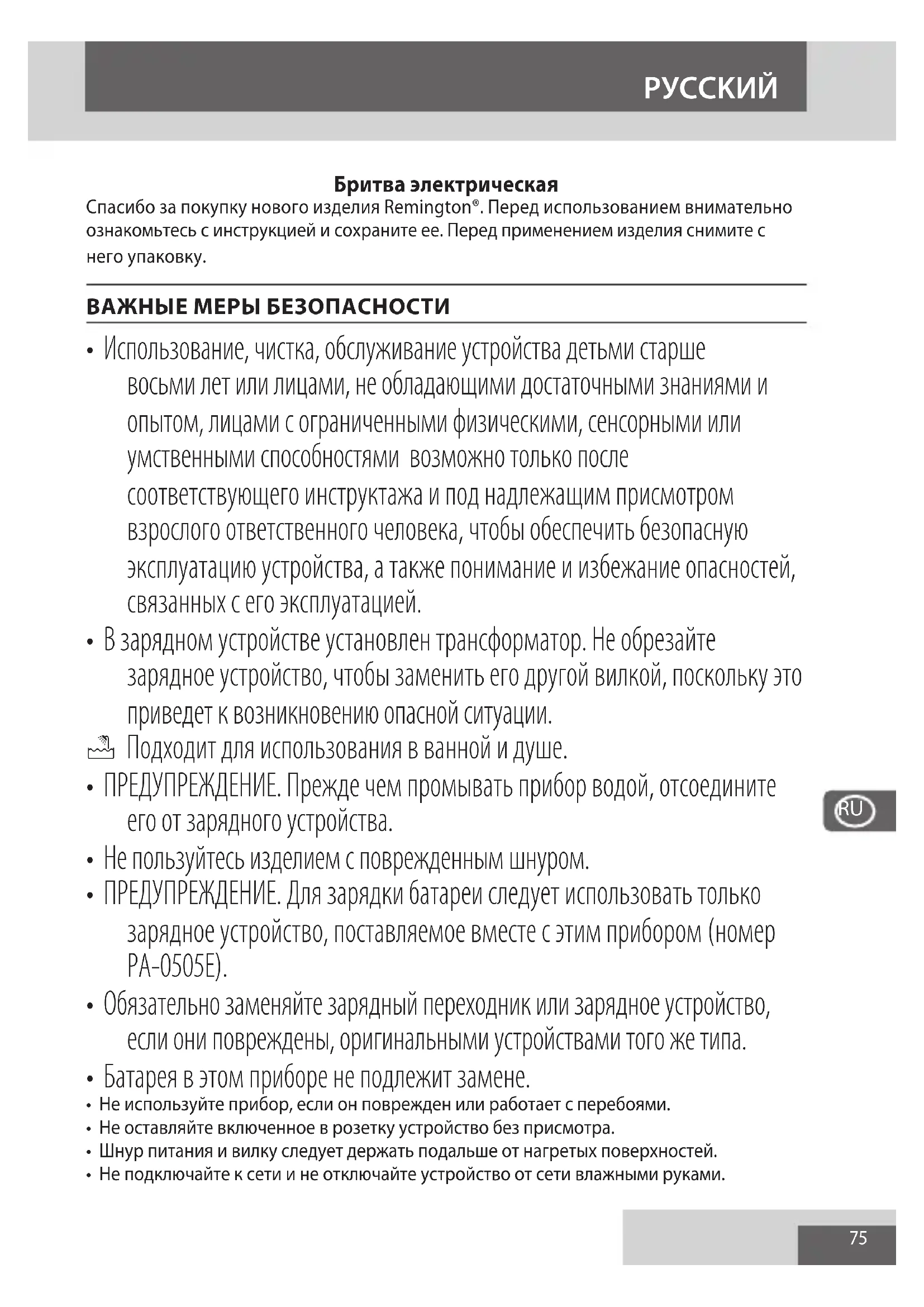 Remington. ИЗВЛЕЧЕНИЕ БАТАРЕИ Настоятельно рекомендуется, чтобы извлечение перезаряжаемой батареи выполнял специалист. На частях корпуса бритвы и приспособлениях есть острые края. Неправильное обращение может привести к травме.