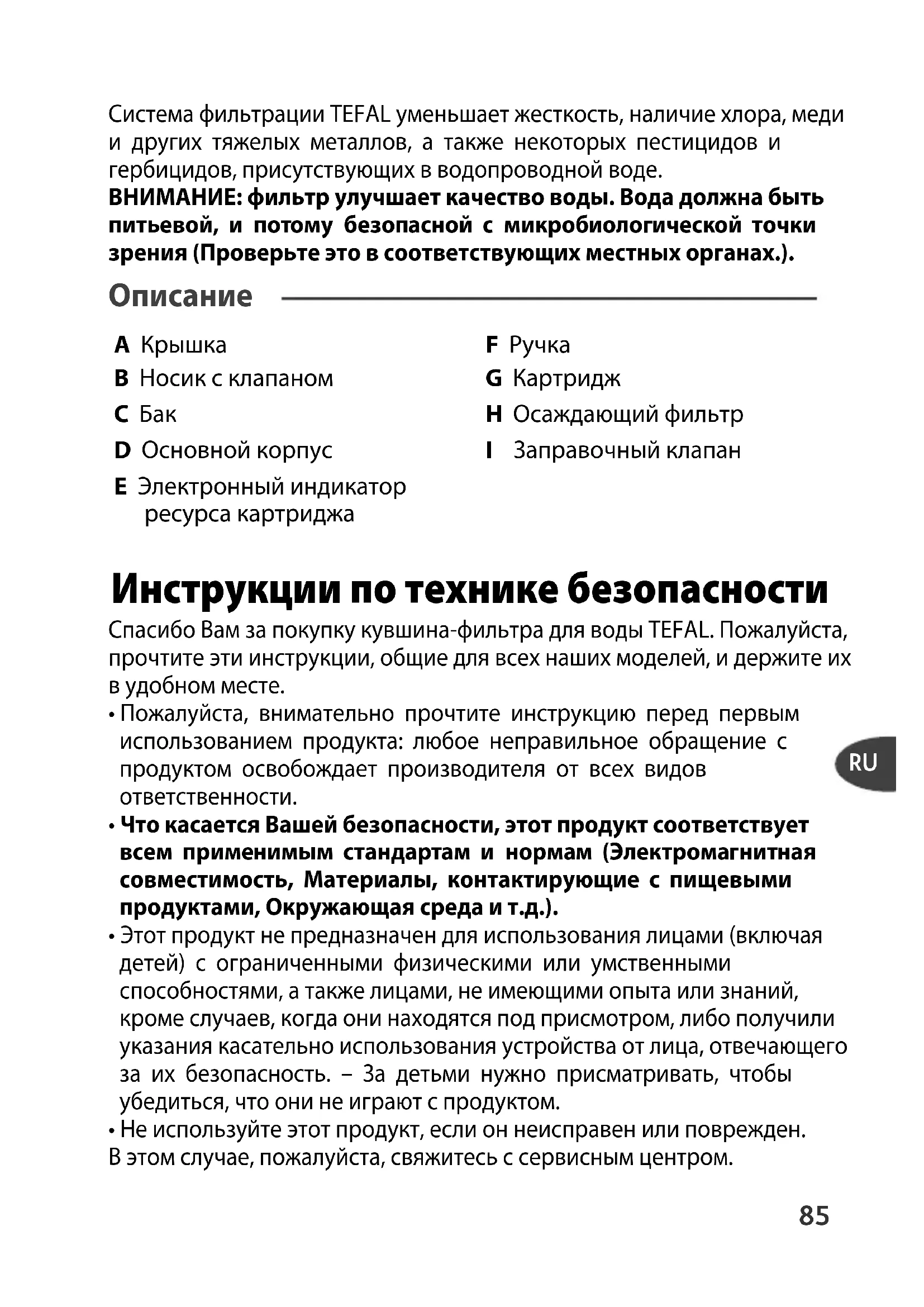 - Не используйте этот продукт, если он неисправен или поврежден. В этом случае, пожалуйста, свяжитесь с сервисным центром. A Крышка B Носик с клапаном C Бак D Основной корпус E Электронный индикатор ресурса картриджа F Ручка G Картридж H Осаждающий фильтр I Заправочный клапан TE_CARAFE_NC00111257_Mise en page 1 04/06/12 09:08 Page8586