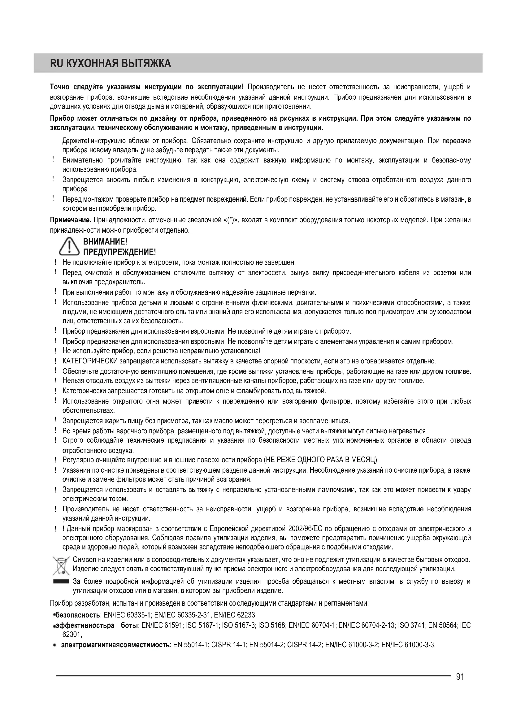 ПРЕДУПРЕЖДЕНИЕ! Не подключайте прибор к электросети, пока монтаж полностью не завершен. Перед очисткой и обслуживанием отключите вытяжку от электросети, вынув вилку присоединительного кабеля из розетки или выключив предохранитель. При выполнении работ по монтажу и обслуживанию надевайте защитные перчатки. Использование прибора детьми и людьм и с ограниченными физическими, двигательными и психическими способностями, а также людьми, не имеющими достаточного опыта или знаний для его использования, допускается только под присмотром или руководством лиц, ответственных за их безопасность. Прибор предназначен для использования взрослыми. Не позволяйте детям играть с прибором. Прибор предназначен для использования взрослыми. Не позволяйте детям играть с элементами управления и самим прибором. Не используйте прибор, если решетка неправильно установлена! КАТЕГОРИЧЕСКИ запрещается использовать вытяжку в кач естве опорной плоскости, если это не оговаривается отдельно. Обеспечьте достаточную вентиляцию помещения, где кроме вытяжки установлены приборы, работающие на газе или другом топливе. Нельзя отводить воздух из вытяжки через вентиляционные каналы приборов, работающих на газе или другом топливе. Категорически запрещается готовить на открытом огне и фламбировать под вытяжкой. Использование откры того огня может привести к повреждению или возгоранию фильтров, поэтому избегайте этого при любых обстоятельствах. Запрещается жарить пищу без пр исмотра, так как масло может перегреться и воспламениться. Во время работы варочного прибора, размещенного под вытяжкой, доступные части вытяжки могут сильно нагреваться. Строго соблюдайте технические предписания и указания по безопасности местных уполномоченных органов в области отвода отработанного воздуха. Регулярно очищайте внутренние и внешние поверхности прибора (НЕ РЕЖЕ ОДНОГО РАЗА В МЕСЯЦ). Указания по очистке приведены в соответствующем разделе данной инструкции. Несоблюдение указ аний по очистке прибора, а также очистке и замене фильтров м ожет стать причиной возгорания. Запрещается использовать и оставлять вытяжку с неправильно установленными лампочками, так как это может привести к удару электрическим током. Производитель не несет ответственность за неисправности, ущерб и возгорание прибора, возникшие вследствие несоблюдения указаний данной инструкции. ! Данный прибор маркирован в соответствии с Европейской директивой 2002/96/ЕС по обращению с отходами от электрического и электронного оборудования. Соблюдая правила утилизации изделия, вы поможете предотвратить причинение ущерба окружаю