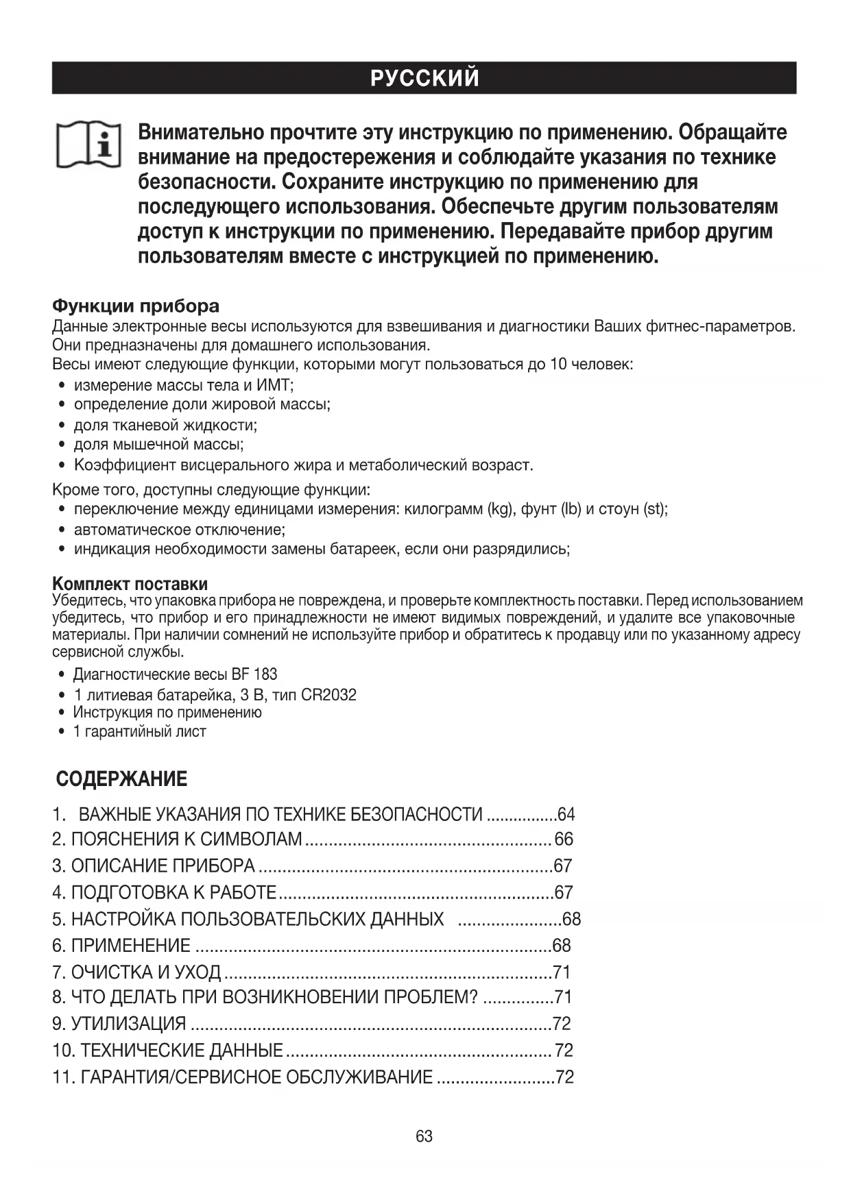 Garanti ve garanti koşulları ile ilgili ayrıntılı bilgileri cihazla birlikte verilen garanti broşüründe bulabilirsiniz. Hata ve değişiklik hakkı saklıdır63 Внимательно прочтите эту инструкцию поприменению. Обращайте внимание напредостережения исоблюдайте указания потехнике безопасности. Сохраните инструкцию поприменению для последующего использования. Обеспечьте другим пользователям доступ кинструкции поприменению. Передавайте прибор другим пользователям вместе синструкцией поприменению. Функции прибора Данные электронные весы используются для взвешивания идиагностики Ваших фитнес-параметров. Они предназначены для домашнего использования. Весы имеют следующие функции, которыми могут пользоваться до 10человек: