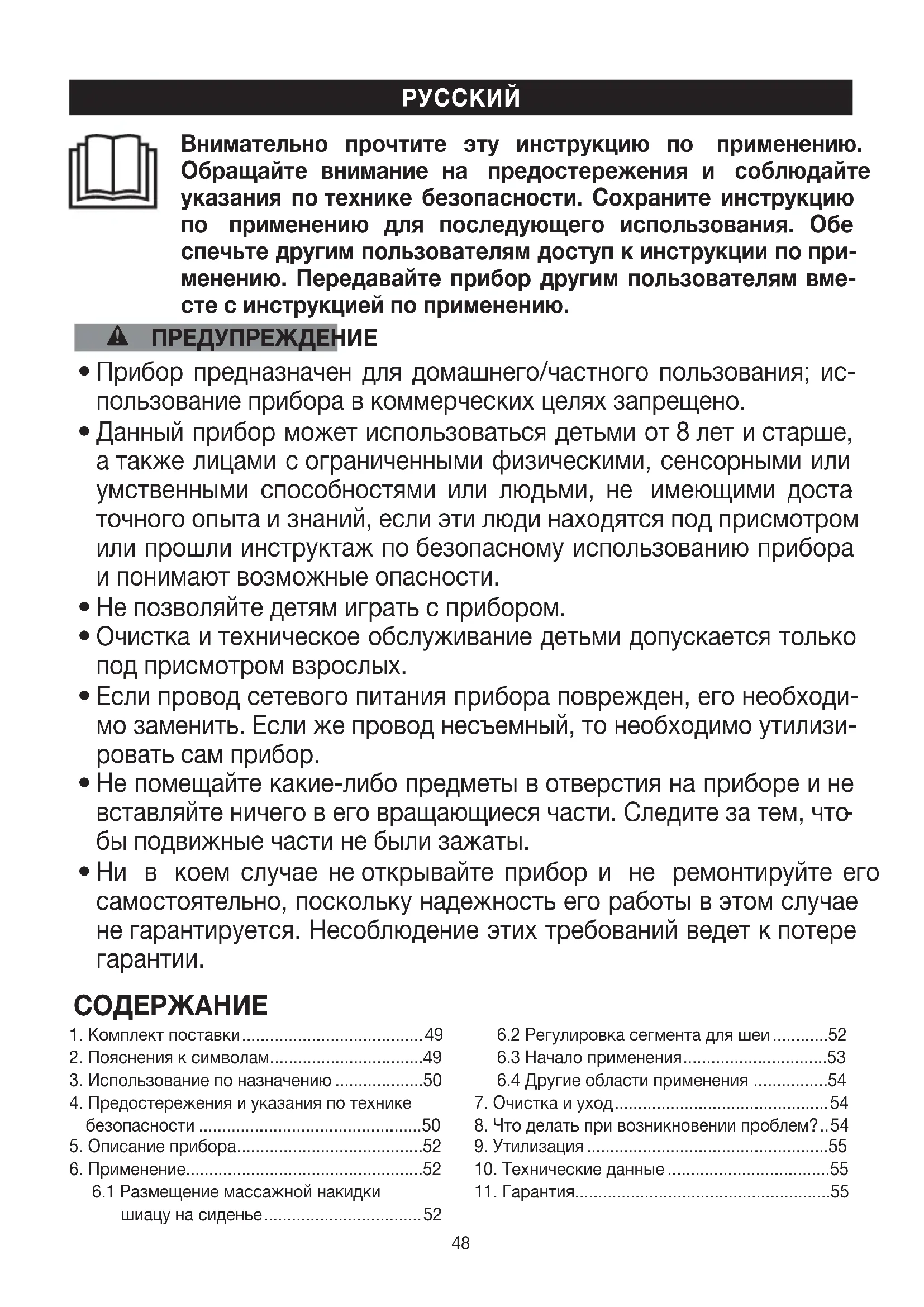 Данный прибор предназначен исключительно для массажа спины ишеи человека. Он не может заменить медицинское лечение. Не пользуйтесь прибором для массажа вслучаях, когда одно или несколько приведенных ниже предупредительных указаний относятся кВам. ПРЕДУПРЕЖДЕНИЕ Не используйте прибор для массажа: