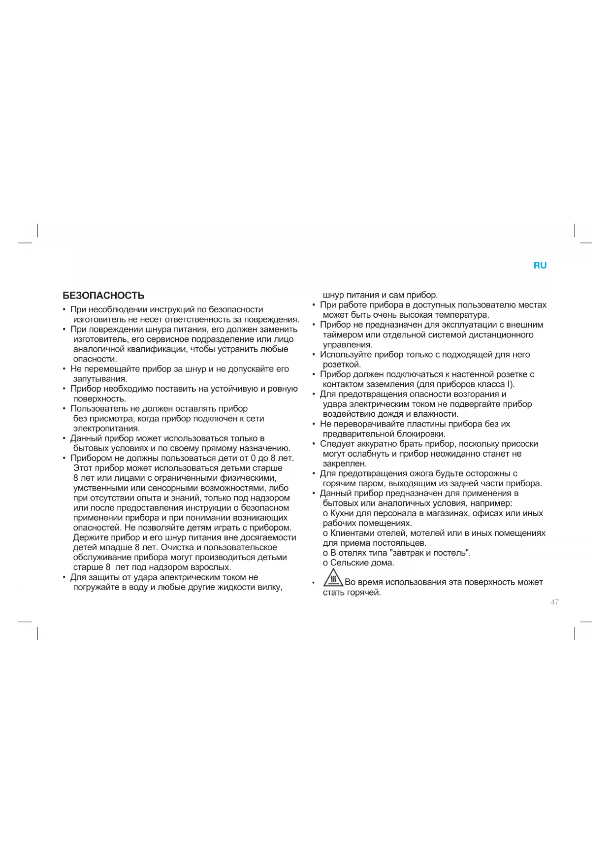 - Прибором не должны пользоваться дети от 0 до 8 лет. Этот прибор может использоваться детьми старше 8 лет или лицами с ограниченными физическими, умственными или сенсорными возможностями, либо при отсутствии опыта и знаний, только под надзором или после предоставления инструкции о безопасном применении прибора и при понимании возникающих опасностей. Не позволяйте детям играть с прибором. Держите прибор и его шнур питания вне досягаемости детей младше 8 лет. Очистка и пользовательское обслуживание прибора могут производиться детьми старше 8 лет под надзором взрослых.