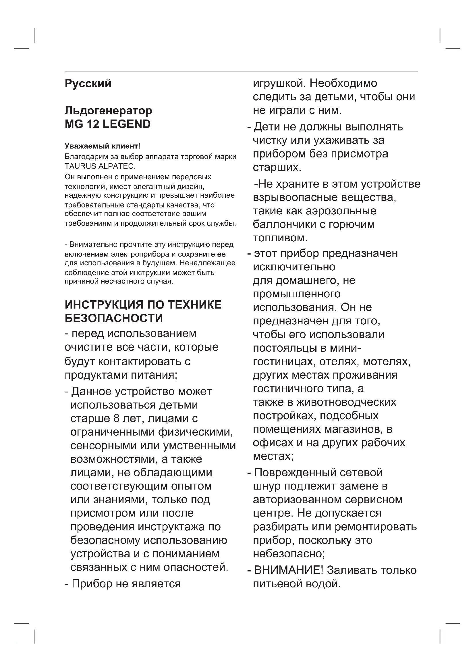 Σβήστε και αποσυνδέστε τη συσκευή για να βγάλετε τα παγάκια. Ξαναθέστε τη συσκευή σε λειτουργία.Русский Льдогенератор MG 12 LEGEND Уважаемый клиент! Благодарим за выбор аппарата торговой марки TAURUS ALPATEC. Он выполнен с применением передовых технологий, имеет элегантный дизайн, надежную конструкцию и превышает наиболее требовательные стандарты качества, что обеспечит полное соответствие вашим требованиям и продолжительный срок службы. - Внимательно прочтите эту инструкцию перед включением электроприбора и сохраните ее для использования в будущем. Ненадлежащее соблюдение этой инструкции может быть причиной несчастного случая. ИНСТРУКЦИЯ ПО ТЕХНИКЕ БЕЗОПАСНОСТИ - перед использованием очистите все части, которые будут контактировать с продуктами питания; - Данное устройство может использоваться детьми старше 8 лет, лицами с ограниченными физическими, сенсорными или умственными возможностями, а также лицами, не обладающими соответствующим опытом или знаниями, только под присмотром или после проведения инструктажа по безопасному использованию устройства и с пониманием связанных с ним опасностей. - Прибор не является игрушкой. Необходимо следить за детьми, чтобы они не играли с ним. - Дети не должны выполнять чистку или ухаживать за прибором без присмотра