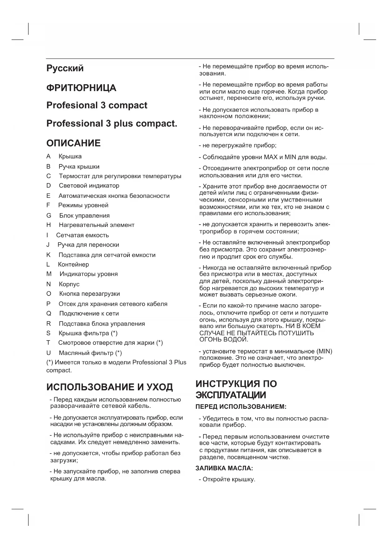 A Крышка B Ручкакрышки C Термостатдлярегулировкитемпературы D Световойиндикатор E Автоматическаякнопкабезопасности F Режимыуровней G Блокуправления H Нагревательныйэлемент I Сетчатаяемкость J Ручкадляпереноски K Подставкадлясетчатойемкости L Контейнер M Индикаторыуровня N Корпус O Кнопкаперезагрузки P Отсекдляхранениясетевогокабеля Q Подключениексети R Подставкаблокауправления S Крышкафильтра(*) T Смотровоеотверстиедляжарки(*) U Масляныйфильтр(*) (*)ИмеетсятольковмоделиProfessional3Plus compact. ИСПОЛЬЗОВАНИЕ И УХОД - Передкаждымиспользованиемполностью разворачивайтесетевойкабель. - Недопускаетсяэксплуатироватьприбор,если насадкинеустановленыдолжнымобразом. - Неиспользуйтеприборснеисправнымина- садками.Ихследуетнемедленнозаменить. - недопускается,чтобыприборработалбез