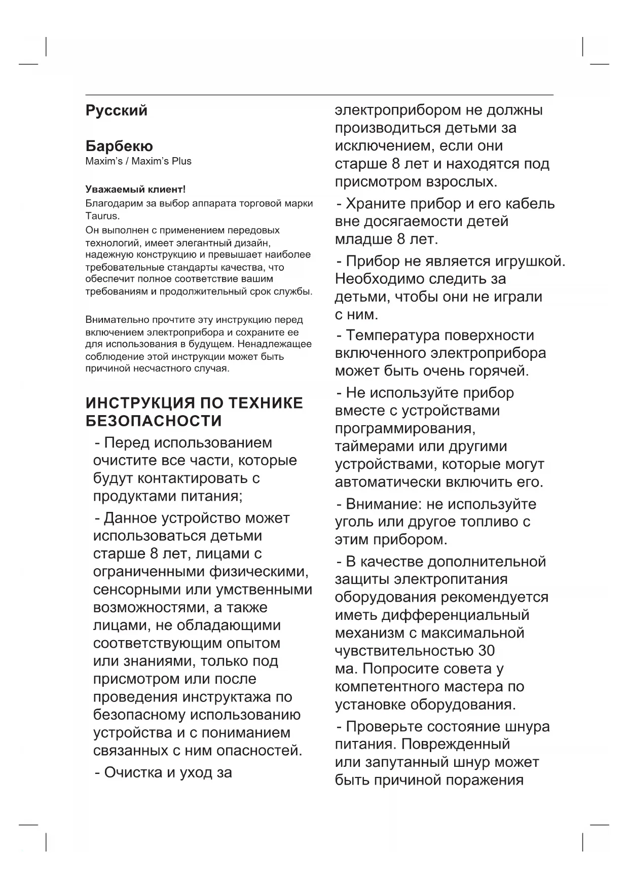 Maxim’s / Maxim’s Plus Уважаемый клиент! Благодарим за выбор аппарата торговой марки Taurus. Он выполнен с применением передовых технологий, имеет элегантный дизайн, надежную конструкцию и превышает наиболее требовательные стандарты качества, что обеспечит полное соответствие вашим требованиям и продолжительный срок службы. Внимательно прочтите эту инструкцию перед включением электроприбора и сохраните ее для использования в будущем. Ненадлежащее соблюдение этой инструкции может быть причиной несчастного случая. ИНСТРУКЦИЯ ПО ТЕХНИКЕ БЕЗОПАСНОСТИ - Перед использованием очистите все части, которые будут контактировать с продуктами питания; - Данное устройство может использоваться детьми старше 8 лет, лицами с ограниченными физическими, сенсорными или умственными возможностями, а также лицами, не обладающими соответствующим опытом или знаниями, только под присмотром или после проведения инструктажа по безопасному использованию устройства и с пониманием связанных с ним опасностей. - Очистка и уход за электроприбором не должны производиться детьми за исключением, если они старше 8 лет и находятся под присмотром взрослых. - Храните прибор и его кабель вне досягаемости детей младше 8 лет. - Прибор не является игрушкой. Необходимо следить за детьми, чтобы они не играли