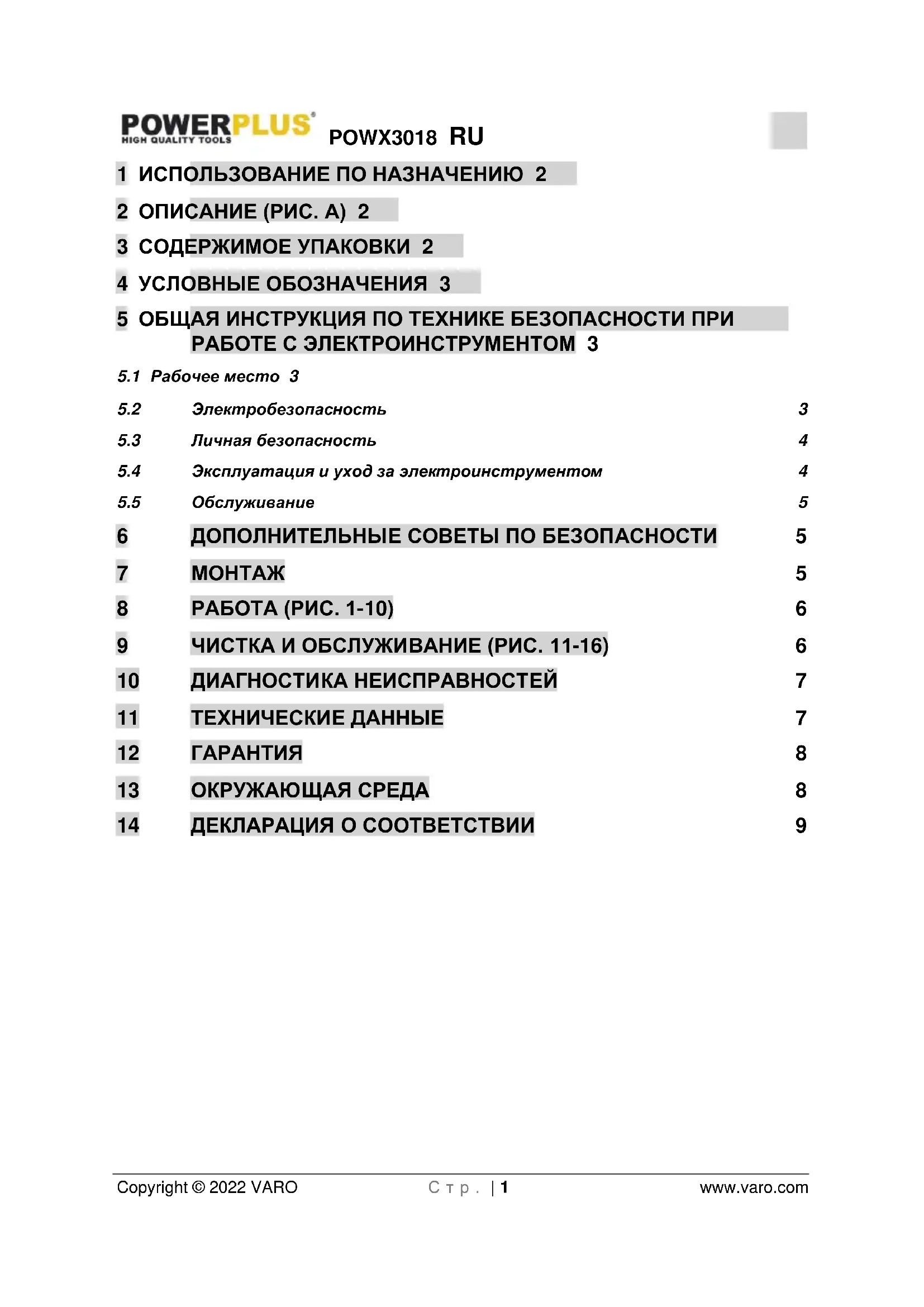 - Содержите электроинструменты в исправности. Следите за тем, чтобы не было смещения или заедания движущих частей, повреждения деталей или какого-либо другого обстоятельства, которое может повлиять на функционирование электроинструментов. Если электроинструмент поврежден, его необходимо отремонтировать. Множество несчастных случаев вызвано ненадлежащим использованием электроинструментов.POWX3018 RU Copyright © 2022 VARO С т р . | 5 www.varo.com