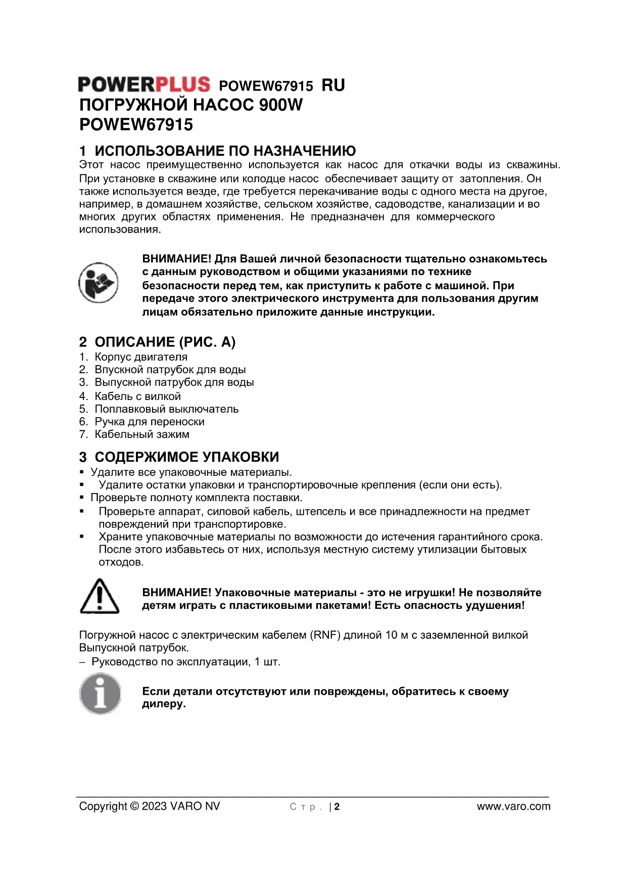 - 16 ДЕКЛАРАЦИЯ СООТВЕТСТВИЯ POWEW67915 RU Copyright © 2023 VARO NV С т р . | 2 www.varo.com ПОГРУЖНОЙ НАСОС 900W POWEW67915 1 ИСПОЛЬЗОВАНИЕ ПО НАЗНАЧЕНИЮ Этот насос преимущественно используется как насос для откачки воды из скважины. При установке в скважине или колодце насос обеспечивает защиту от затопления. Он также используется везде, где требуется перекачивание воды с одного места на другое, например, в домашнем хозяйстве, сельском хозяйстве, садоводстве, канализации и во многих других областях применения. Не предназначен для коммерческого использования. ВНИМАНИЕ! Для Вашей личной безопасности тщательно ознакомьтесь с данным руководством и общими указаниями по технике безопасности перед тем, как приступить к работе с машиной. При передаче этого электрического инструмента для пользования другим лицам обязательно приложите данные инструкции. 2 ОПИСАНИЕ (РИС. A) p. 8