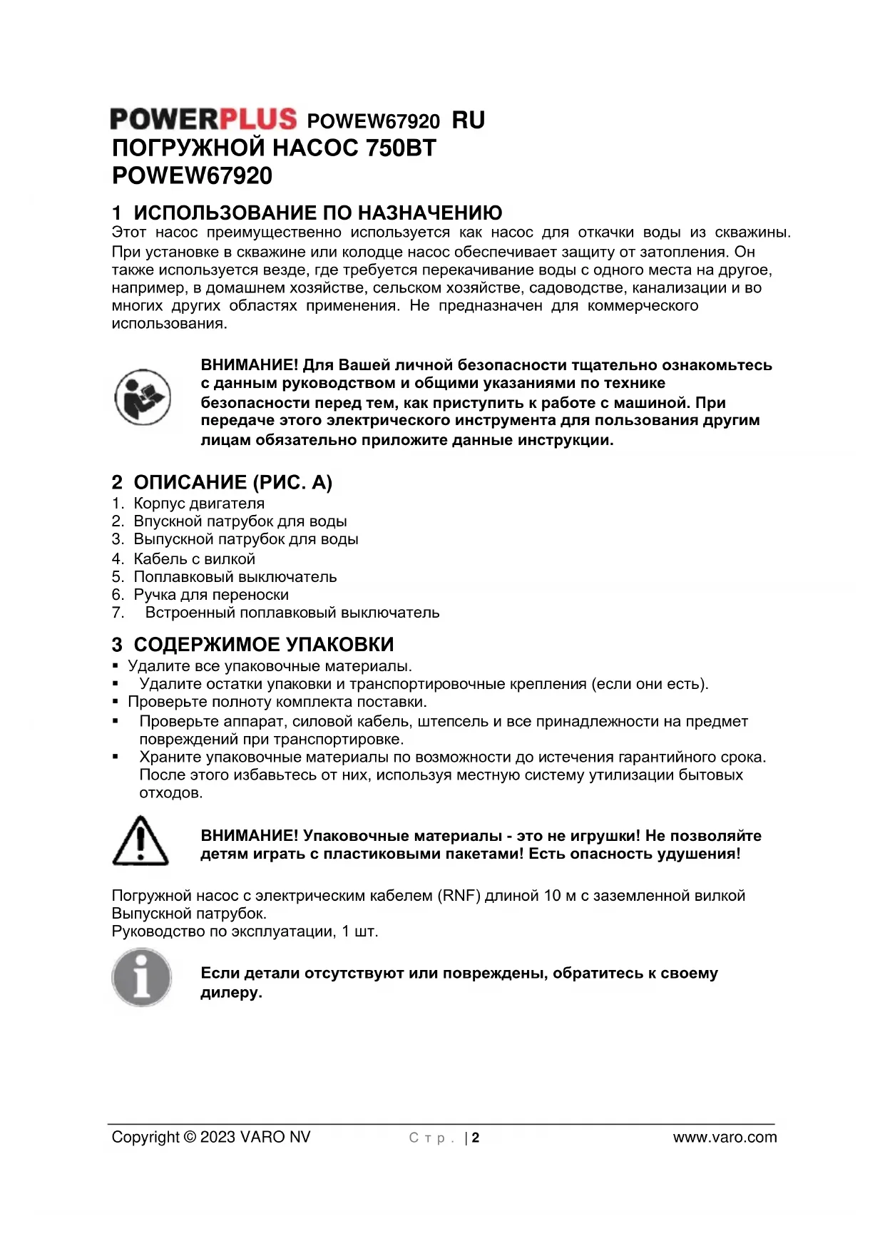 - 16 ДЕКЛАРАЦИЯ СООТВЕТСТВИЯ POWEW67920 RU Copyright © 2023 VARO NV С т р . | 2 www.varo.com ПОГРУЖНОЙ НАСОС 750ВТ POWEW67920 1 ИСПОЛЬЗОВАНИЕ ПО НАЗНАЧЕНИЮ Этот насос преимущественно используется как насос для откачки воды из скважины. При установке в скважине или колодце насос обеспечивает защиту от затопления. Он также используется везде, где требуется перекачивание воды с одного места на другое, например, в домашнем хозяйстве, сельском хозяйстве, садоводстве, канализации и во многих других областях применения. Не предназначен для коммерческого использования. ВНИМАНИЕ! Для Вашей личной безопасности тщательно ознакомьтесь с данным руководством и общими указаниями по технике безопасности перед тем, как приступить к работе с машиной. При передаче этого электрического инструмента для пользования другим лицам обязательно приложите данные инструкции. 2 ОПИСАНИЕ (РИС. A) p. 8