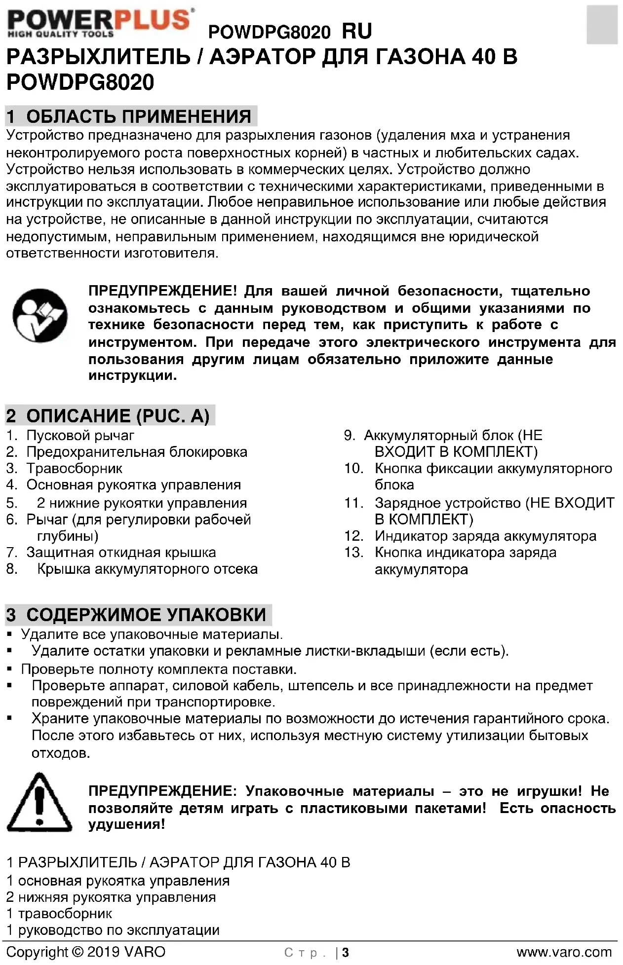 - 20 ДЕКЛАРАЦИЯ О СООТВЕТСТВИИ POWDPG8020 RU Copyright © 2019 VARO С т р . | 3 www.varo.com РАЗРЫХЛИТЕЛЬ / АЭРАТОР ДЛЯ ГАЗОНА 40 В POWDPG8020 1 ОБЛАСТЬ ПРИМЕНЕНИЯ Устройство предназначено для разрыхления газонов (удаления мха и устранения неконтролируемого роста поверхностных корней) в частных и любительских садах. Устройство нельзя использовать в коммерческих целях. Устройство должно эксплуатироваться в соответствии с техническими характеристиками, приведенными в инструкции по эксплуатации. Любое неправильное использование или любые действия на устройстве, не описанные в данной инструкции по эксплуатации, считаются недопустимым, неправильным применением, находящимся вне юридической ответственности изготовителя. ПРЕДУПРЕЖДЕНИЕ! Для вашей личной безопасности, тщательно ознакомьтесь с данным руководством и общими указаниями по технике безопасности перед тем, как приступить к работе с инструментом. При передаче этого электрического инструмента для пользования другим лицам обязательно приложите данные инструкции. 2 ОПИСАНИЕ (РUС. A) p. 17