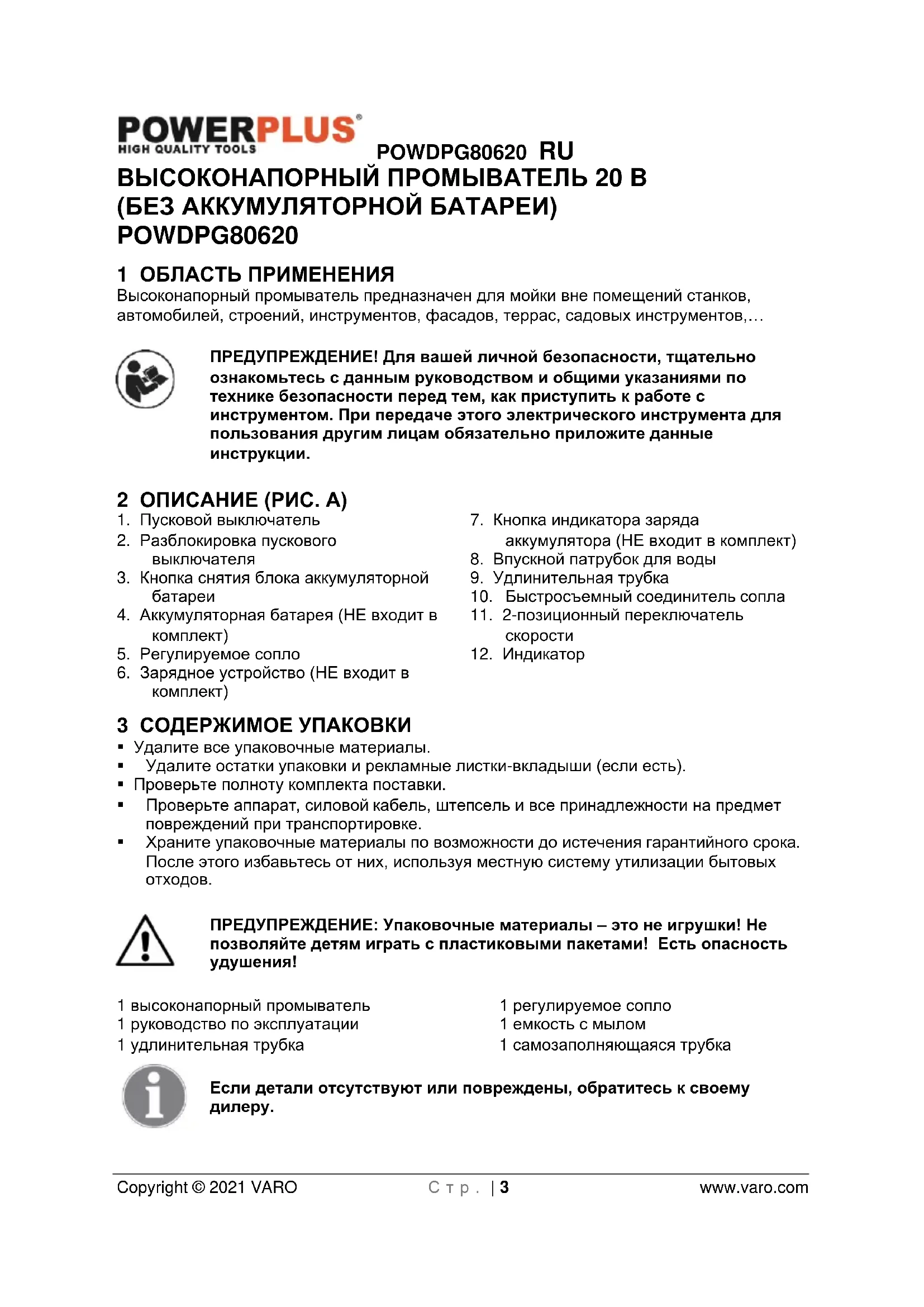 - 15 ОКРУЖАЮЩАЯ СРЕДА POWDPG80620 RU Copyright © 2021 VARO С т р . | 3 www.varo.com ВЫСОКОНАПОРНЫЙ ПРОМЫВАТЕЛЬ 20 B (БЕЗ АККУМУЛЯТОРНОЙ БАТАРЕИ) POWDPG80620 1 ОБЛАСТЬ ПРИМЕНЕНИЯ Высоконапорный промыватель предназначен для мойки вне помещений станков, автомобилей, строений, инструментов, фасадов, террас, садовых инструментов,… ПРЕДУПРЕЖДЕНИЕ! Для вашей личной безопасности, тщательно ознакомьтесь с данным руководством и общими указаниями по технике безопасности перед тем, как приступить к работе с инструментом. При передаче этого электрического инструмента для пользования другим лицам обязательно приложите данные инструкции. 2 ОПИСАНИЕ (РИС. А) p. 13
