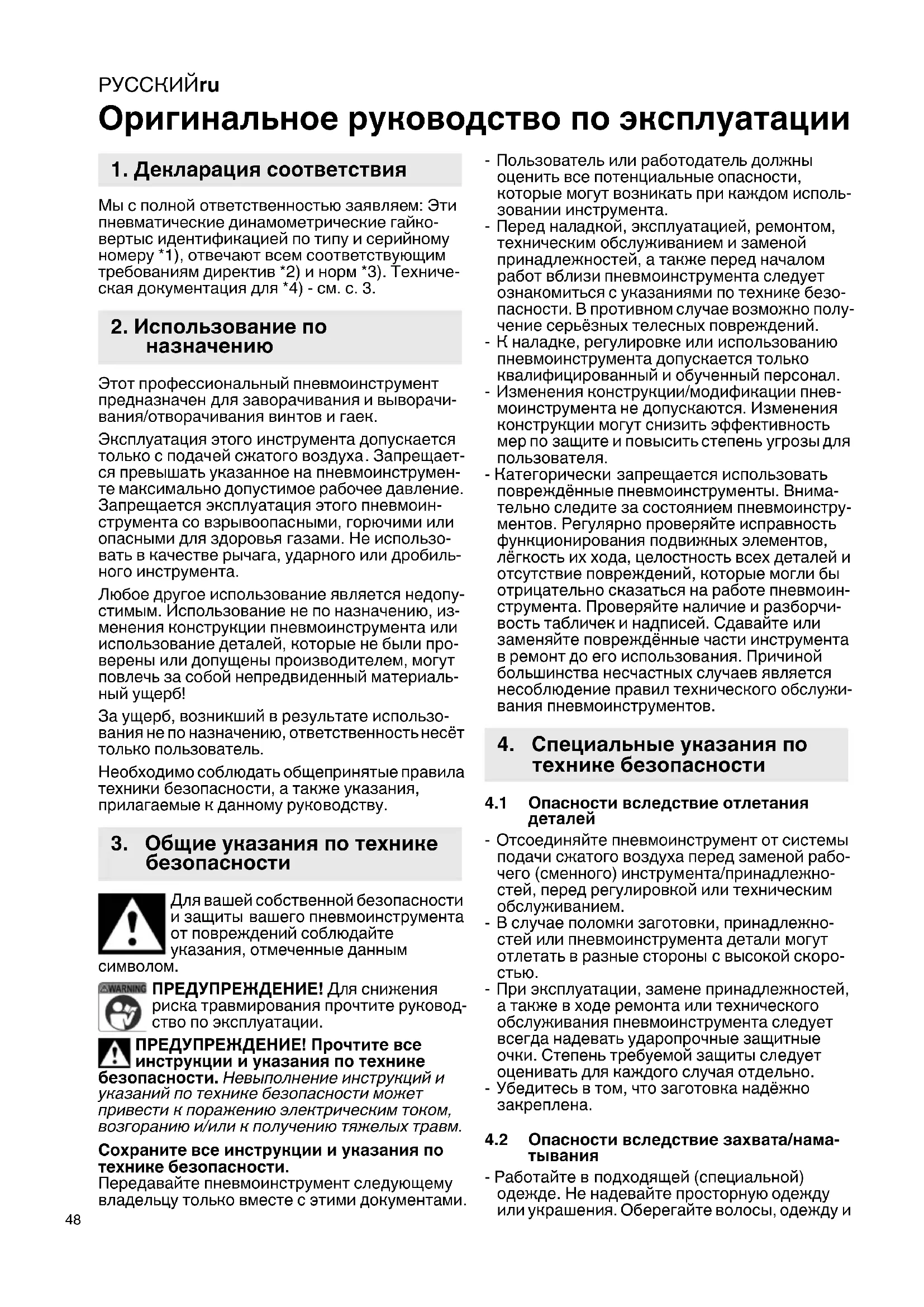 Оригинальное руководство по эксплуатации Мы с полной ответственностью заявляем: Эти пневматические динамометрические гайко- вертыс идентификацией по типу и серийному номеру *1), отвечают всем соответствующим требованиям директив *2) и норм *3). Техниче- ская документация для *4) - см. с. 3. Этот профессиональный пневмоинструмент предназначен для заворачивания и выворачи- вания/отворачивания винтов и гаек. Эксплуатация этого инструмента допускается только с подачей сжатого воздуха . Запрещает- ся превышать указанное на пневмоинструмен- те максимально допустимое рабочее давление. Запрещается эксплуатация этого пневмоин- струмента со взрывоопасными, горючими или опасными для здоровья газами. Не использо- вать в качестве рычага, ударного или дробиль- ного инструмента. Любое другое использование является недопу- стимым. Использование не по назначению, из- менения конструкции пневмоинструмента или использование деталей, которые не были про- верены или допущены производителем, могут повлечь за собой непредвиденный материаль-
