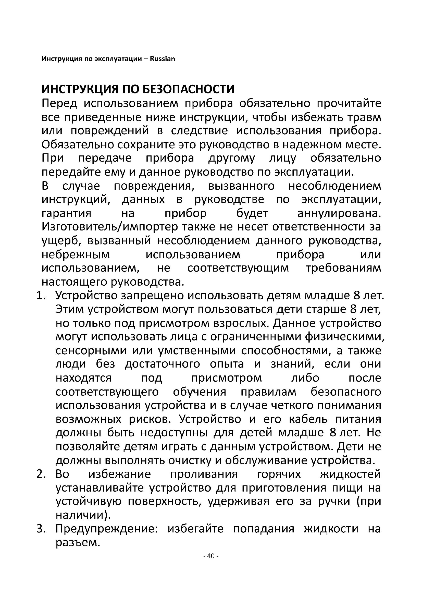Этим устройством могут пользоваться дети старше 8 лет, но только под присмотром взрослых. Данное устройство могут использовать лица с ограниченными физическими, сенсорными или умственными способностями, а также люди без достаточного опыта и знаний, если они находятся под присмотром либо после соответствующего обучения правилам безопасного использования устройства и в случае четкого понимания возможных рисков. Устройство и его кабель питания должны быть недоступны для детей младше 8 лет. Не позволяйте детям играть с данным устройством. Дети не должны выполнять очистку и обслуживание устройства.