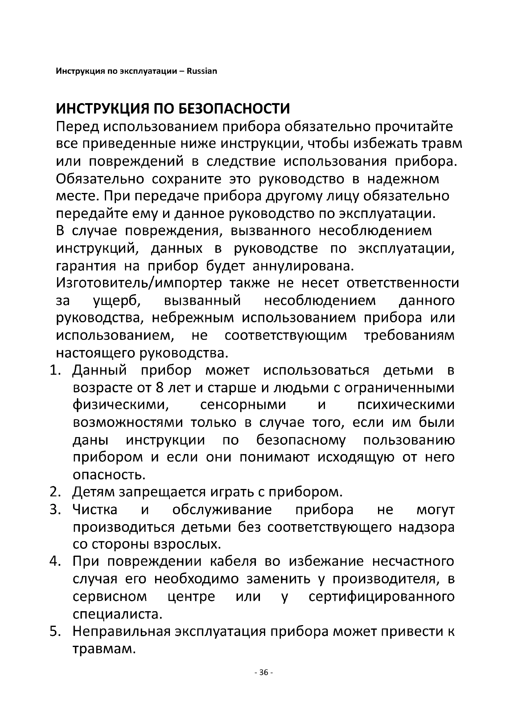 Informacje dla konsumentów na temat sposobu instalacji, użytkowania i konserwacji produktu oraz informacje na temat WEEE podano w instrukcji znajdującej się w opakowaniu.- 36 - Инструкция по эксплуатации – Russian ИНСТРУКЦИЯ ПО БЕЗОПАСНОСТИ Перед использованием прибора обязательно прочитайте все приведенные ниже инструкции, чтобы избежать травм или повреждений в следствие использования прибора. Обязательно сохраните это руководство в надежном месте. При передаче прибора другому лицу обязательно передайте ему и данное руководство по эксплуатации. В случае повреждения, вызванного несоблюдением инструкций, данных в руководстве по эксплуатации, гарантия на прибор будет аннулирована. Изготовитель/импортер также не несет ответственности за ущерб, вызванный несоблюдением данного руководства, небрежным использованием прибора или использованием, не соответствующим требованиям настоящего руководства.