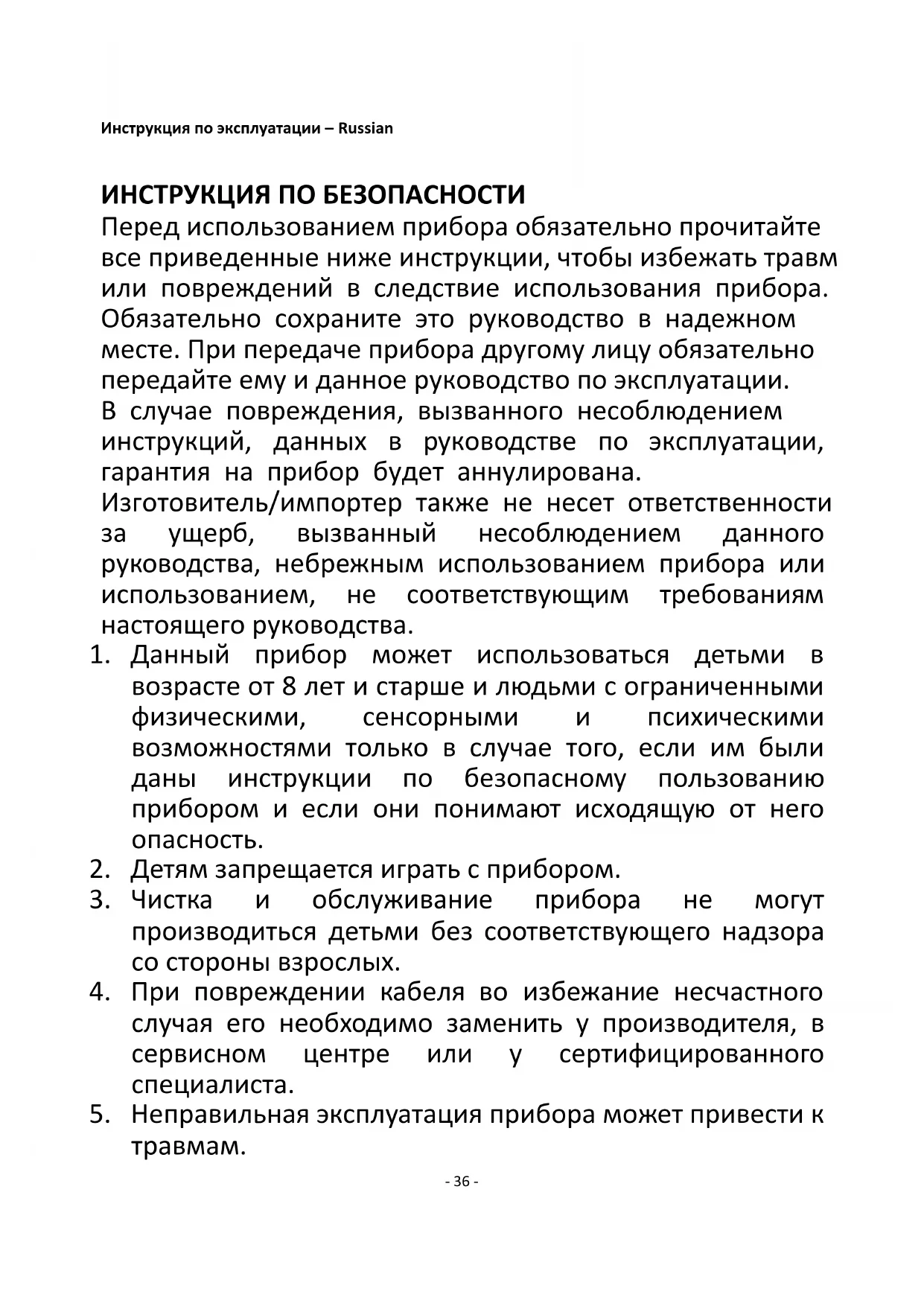 Инструкция по эксплуатации – Russian ИНСТРУКЦИЯ ПО БЕЗОПАСНОСТИ Перед использованием прибора обязательно прочитайте все приведенные ниже инструкции, чтобы избежать травм или повреждений в следствие использования прибора. Обязательно сохраните это руководство в надежном месте. При передаче прибора другому лицу обязательно передайте ему и данное руководство по эксплуатации. В случае повреждения, вызванного несоблюдением инструкций, данных в руководстве по эксплуатации, гарантия на прибор будет аннулирована. Изготовитель/импортер также не несет ответственности за ущерб, вызванный несоблюдением данного руководства, небрежным использованием прибора или использованием, не соответствующим требованиям настоящего руководства.