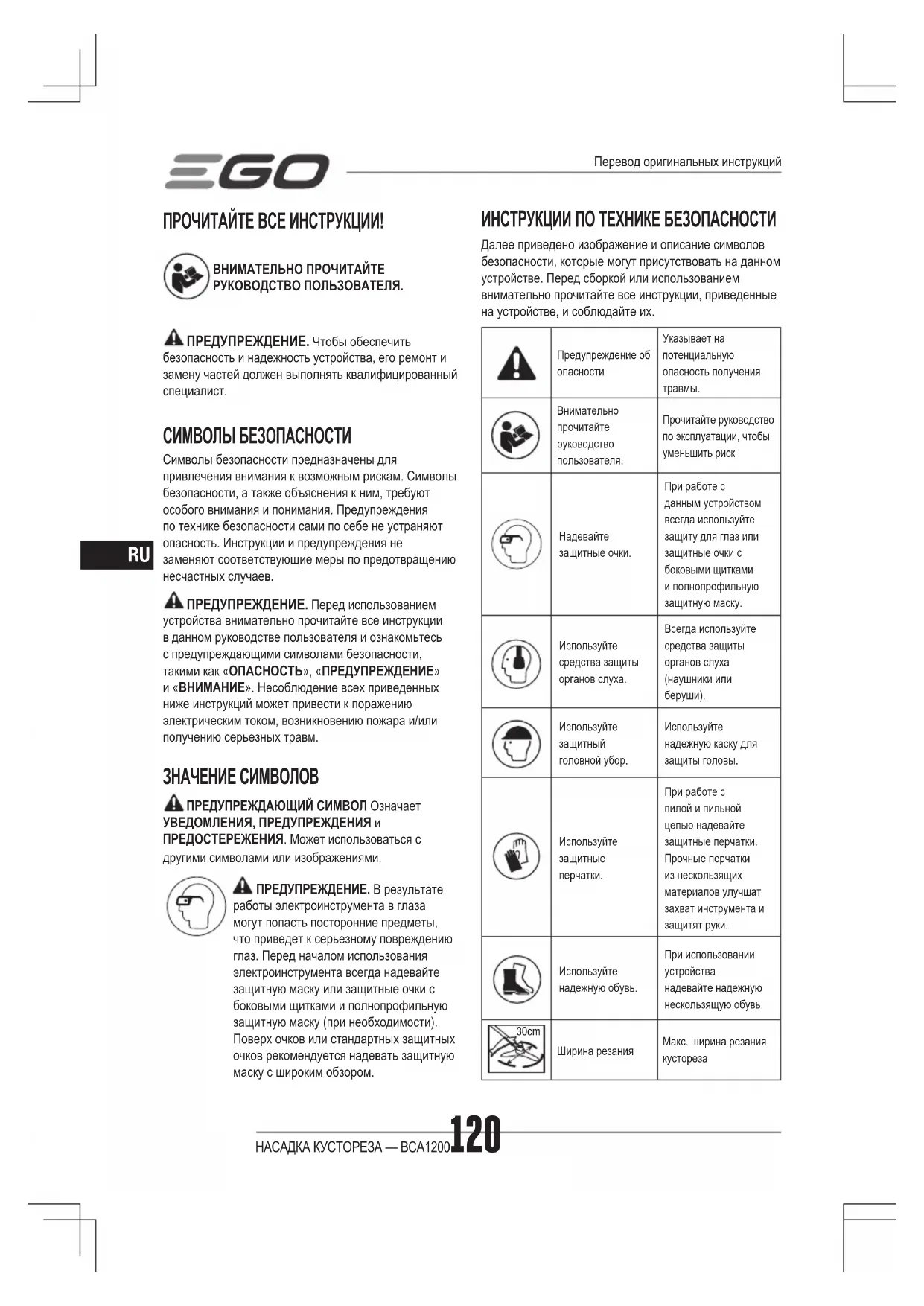 ПРОЧИТАЙТЕ ВСЕ ИНСТРУКЦИИ! ВНИМАТЕЛЬНО ПРОЧИТАЙТЕ РУКОВОДСТВО ПОЛЬЗОВАТЕЛЯ. ПРЕДУПРЕЖДЕНИЕ. Чтобы обеспечить безопасность и надежность устройства, его ремонт и замену частей должен выполнять квалифицированный специалист. СИМВОЛЫ БЕЗОПАСНОСТИ Символы безопасности предназначены для привлечения внимания к возможным рискам. Символы безопасности, а также объяснения к ним, требуют особого внимания и понимания. Предупреждения по технике безопасности сами по себе не устраняют опасность. Инструкции и предупреждения не заменяют соответствующие меры по предотвращению несчастных случаев. ПРЕДУПРЕЖДЕНИЕ. Перед использованием устройства внимательно прочитайте все инструкции в данном руководстве пользователя и ознакомьтесь с предупреждающими символами безопасности, такими как «ОПАСНОСТЬ», «ПРЕДУПРЕЖДЕНИЕ» и «ВНИМАНИЕ». Несоблюдение всех приведенных ниже инструкций может привести к поражению электрическим током, возникновению пожара и/или получению серьезных травм. ЗНАЧЕНИЕ СИМВОЛОВ ПРЕДУПРЕЖДАЮЩИЙ СИМВОЛ Означает УВЕДОМЛЕНИЯ, ПРЕДУПРЕЖДЕНИЯ и ПРЕДОСТЕРЕЖЕНИЯ. Может использоваться с другими символами или изображениями. ПРЕДУПРЕЖДЕНИЕ. В результате работы электроинструмента в глаза могут попасть посторонние предметы, что приведет к серьезному повреждению глаз. Перед началом использования электроинструмента всегда надевайте защитную маску или защитные очки с боковыми щитками и полнопрофильную защитную маску (при необходимости). Поверх очков или стандартных защитных очков рекомендуется надевать защитную маску с широким обзором. ИНСТРУКЦИИ ПО ТЕХНИКЕ БЕЗОПАСНОСТИ Далее приведено изображение и описание символов безопасности, которые могут присутствовать на данном устройстве. Перед сборкой или использованием внимательно прочитайте все инструкции, приведенные на устройстве, и соблюдайте их. Предупреждение об опасностиУказывает на потенциальную опасность получения травмы.Внимательно прочитайте руководство пользователя.Прочитайте руководство по эксплуатации, чтобы уменьшить риск Надевайте защитные очки.При работе с данным устройством всегда используйте защиту для глаз или защитные очки с боковыми щитками и полнопрофильную защитную маску.Используйте средства защиты органов слуха.Всегда используйте средства защиты органов слуха (наушники или беруши).Используйте защитный головной убор.Используйте надежную каску для защиты головы.Используйте защитные перчатки.При работе с пилой и пильной цепью надевайте защитные перчатки. Прочные перчатки из нескользящих материалов улучшат захват инструмента и защитят руки.Используйте надежную обувь.При использовании устройства надевайте надежную нескользящую обувь. 30cm Ширина резанияМакс. ширина резания кустореза Перевод оригинальных инструкцийНАСАДКА КУСТОРЕЗА — BCA1200 121