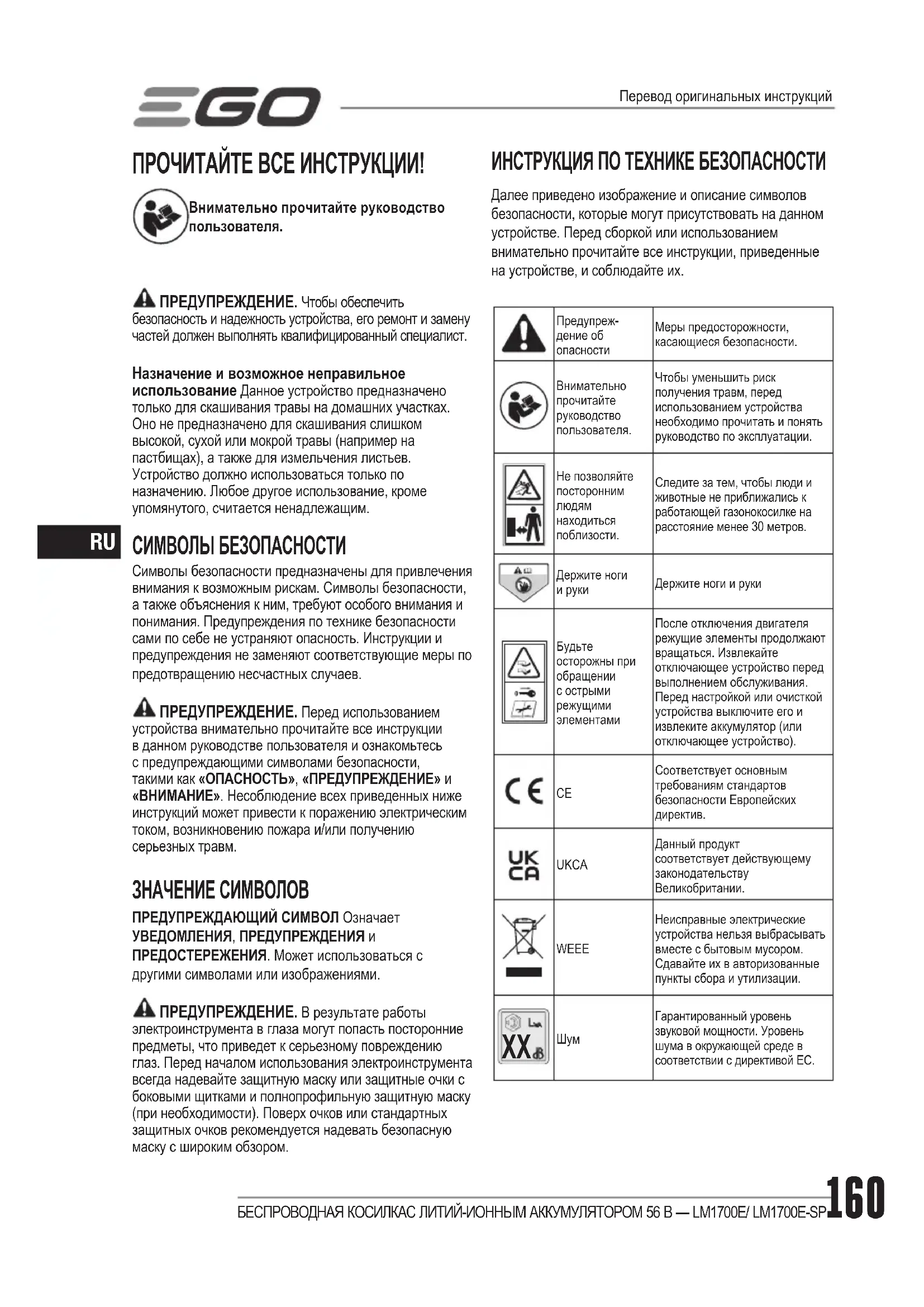 ПРОЧИТАЙТЕ ВСЕ ИНСТРУКЦИИ! Внимательно прочитайте руководство пользователя. ПРЕДУПРЕЖДЕНИЕ. Чтобы обеспечить безопасность и надежность устройства, его ремонт и замену частей должен выполнять квалифицированный специалист.Назначение и возможное неправильное использование Данное устройство предназначено только для скашивания травы на домашних участках. Оно не предназначено для скашивания слишком высокой, сухой или мокрой травы (например на пастбищах), а также для измельчения листьев. Устройство должно использоваться только по назначению. Любое другое использование, кроме упомянутого, считается ненадлежащим. СИМВОЛЫ БЕЗОПАСНОСТИ Символы безопасности предназначены для привлечения внимания к возможным рискам. Символы безопасности, а также объяснения к ним, требуют особого внимания и понимания. Предупреждения по технике безопасности сами по себе не устраняют опасность. Инструкции и предупреждения не заменяют соответствующие меры по предотвращению несчастных случаев. ПРЕДУПРЕЖДЕНИЕ. Перед использованием устройства внимательно прочитайте все инструкции в данном руководстве пользователя и ознакомьтесь с предупреждающими символами безопасности, такими как «ОПАСНОСТЬ», «ПРЕДУПРЕЖДЕНИЕ» и «ВНИМАНИЕ». Несоблюдение всех приведенных ниже инструкций может привести к поражению электрическим током, возникновению пожара и/или получению серьезных травм. ЗНАЧЕНИЕ СИМВОЛОВ ПРЕДУПРЕЖДАЮЩИЙ СИМВОЛ Означает УВЕДОМЛЕНИЯ, ПРЕДУПРЕЖДЕНИЯ и ПРЕДОСТЕРЕЖЕНИЯ. Может использоваться с другими символами или изображениями. ПРЕДУПРЕЖДЕНИЕ. В результате работы электроинструмента в глаза могут попасть посторонние предметы, что приведет к серьезному повреждению глаз. Перед началом использования электроинструмента всегда надевайте защитную маску или защитные очки с боковыми щитками и полнопрофильную защитную маску (при необходимости). Поверх очков или стандартных защитных очков рекомендуется надевать безопасную маску с широким обзором. ИНСТРУКЦИЯ ПО ТЕХНИКЕ БЕЗОПАСНОСТИ Далее приведено изображение и описание символов безопасности, которые могут присутствовать на данном устройстве. Перед сборкой или использованием внимательно прочитайте все инструкции, приведенные на устройстве, и соблюдайте их.Предупреж-дение об опасностиМеры предосторожности, касающиеся безопасности.Внимательно прочитайте руководство пользователя.Чтобы уменьшить риск получения травм, перед использованием устройства необходимо прочитать и понять руководство по эксплуатации.Не позволяйте посторонним людям находиться поблизости.Следите за тем, чтобы люди и животные не приближались к работающей газонокосилке на расстояние менее 30 метров.Держите ноги и рукиДержите ноги и рукиБудьте осторожны при обращении с острыми режущими элементамиПосле отключения двигателя режущие элементы продолжают вращаться. Извлекайте отключающее устройство перед выполнением обслуживания. Перед настройкой или очисткой устройства выключите его и извлеките аккумулятор (или отключающее устройство). Соответствует основным требованиям стандартов безопасности Европейских директив. UKCA Данный продукт соответствует действующему законодательству Великобритании.WEEE Неисправные электрические устройства нельзя выбрасывать вместе с бытовым мусором. Сдавайте их в авториз