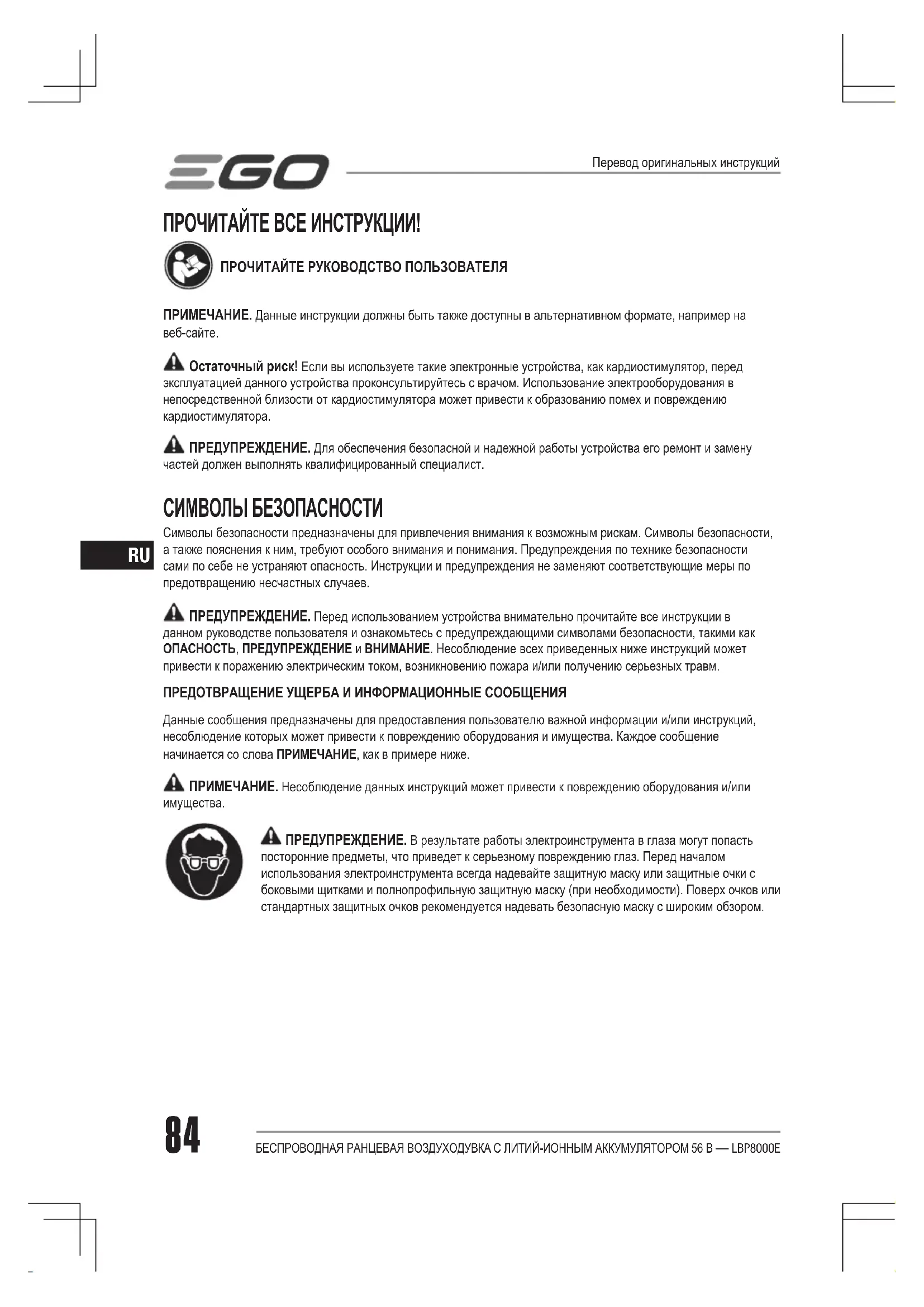 ПРЕДУПРЕЖДЕНИЕ. В результате работы электроинструмента в глаза могут попасть посторонние предметы, что приведет к серьезному повреждению глаз. Перед началом использования электроинструмента всегда надевайте защитную маску или защитные очки с боковыми щитками и полнопрофильную защитную маску (при необходимости). Поверх очков или стандартных защитных очков рекомендуется надевать безопасную маску с широким обзором. Перевод оригинальных инструкцийБЕСПРОВОДНАЯ РАНЦЕВАЯ ВОЗДУХОДУВКА С ЛИТИЙ-ИОННЫМ АККУМУЛЯТОРОМ 56 В — LBP8000E 85