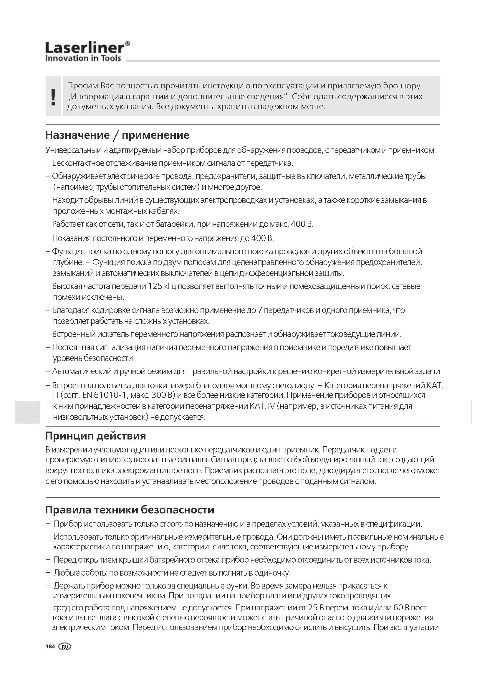 Универсальный и адаптируемый набор приборов для обнаружения проводов, с передатчиком и приемником – Бесконтактное отслеживание приемником сигнала от передатчика. – Обнаруживает электрические провода, предохранители, защитные выключатели, металлические трубы (например, трубы отопительных систем) и многое другое. – Находит обрывы линий в существующих электропроводках и установках, а также короткие замыкания в проложенных монтажных кабелях. – Работает как от сети, так и от батарейки, при напряжении до макс. 400 В. – Показания постоянного и переменного напряжения до 400 В. – Функция поиска по одному полюсу для оптимального поиска проводов и других объектов на большой глубине. – Функция поиска по двум полюсам для целенаправленного обнаружения предохранителей, замыканий и автоматических выключателей в цепи дифференциальной защиты. – Высокая частота передачи 125 кГц позволяет выполнять точный и помехозащищенный поиск, сетевые помехи исключены. – Благодаря кодировке сигнала возможно применение до 7 передатчиков и одного приемника, что позволяет работать на сложных установках. – Встроенный искатель переменного напряжения распознает и обнаруживает токоведущие линии. – Постоянная сигнализация наличия переменного напряжения в приемнике и передатчике повышает уровень безопасности. – Автоматический и ручной режим для правильной настройки к решению конкретной измерительной задачи – Встроенная подсветка для точки замера благодаря мощному светодиоду. – Категория перенапряжений КАТ. III (согл. EN 61010-1, макс. 300 В) и все более низкие категории. Применение приборов и относящихся к ним принадлежностей в категории перенапряжений КАТ. IV (например, в источниках питания для низковольтных установок) не допускается. – Прибор использовать только строго по назначению и в пределах условий, указанных в спецификации. – Использовать только оригинальные измерительные провода. Они должны иметь правильные номинальные характеристики по напряжению, категории, силе тока, соответствующие измерительному прибору. – Перед открытием крышки батарейного отсека прибор необходимо отсоединить от всех источников тока. – Любые работы по возможности не следует выполнять в одиночку. – Держать прибор можно только за специальные ручки. Во время замера нельзя прикасаться к измерительным наконечникам. При попадании на прибор влаги или других токопроводящих сред его работа под напряжением не допускается. При напряжении от 25 В перем. тока и/или 60 В пост. тока и выше влага с высокой степенью вероятности может стать причиной опасного для жизни поражения электрическим током. Перед использованием прибор необходимо очистить и высушить. При эксплуатации Назначение / применение Правила техники безопасности Принцип действия В измерении участвуют один или несколько передатчиков и один приемник. Передатчик подает в проверяемую линию кодированные сигналы. Сигнал представляет собой модулированный ток, создающий вокруг проводника электромагнитное поле. Приемник распознает это поле, декодирует его, после чего может с его помощью находить и устанавливать местоположение проводов с поданным сигналом. Manual_CableTracer-Pro_Rev.0710_RU.indd 184 21.10.2010 16:10:38 UhrCableTracer Pro
